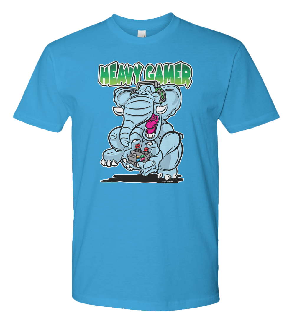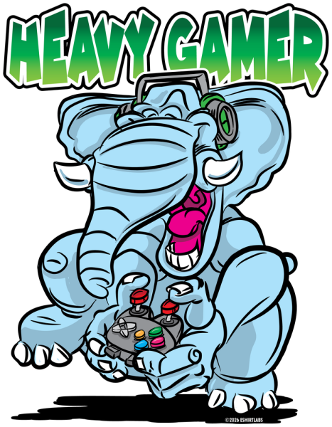 heavy gamer, gamer elephant, cartoon elephant gamer, funny gamer shirt, elephant with headphones, joystick illustration, gaming animal art, video game lover gift, cute gamer design, gaming lifestyle apparel