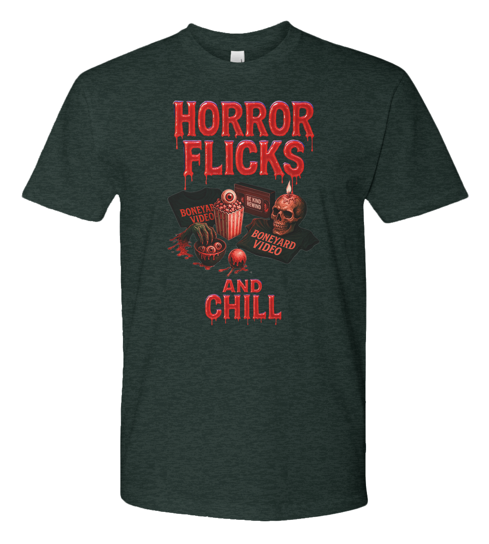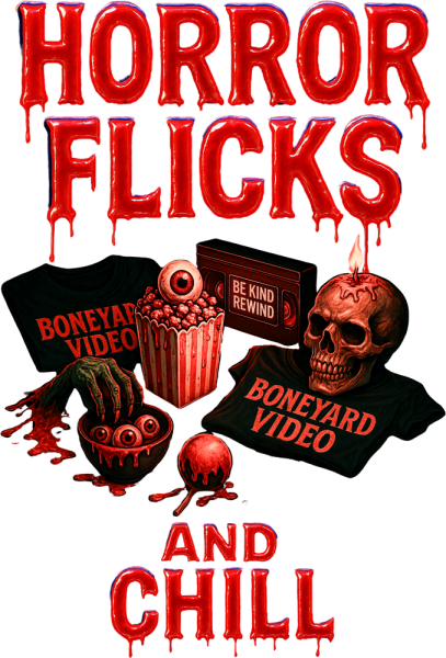 Sink into the blood-soaked glow of movie night with this killer design straight from the Boneyard. Featuring a drippy retro font, cursed popcorn, eyeball snacks, and a VHS warning from beyond the gravethis tee screams nostalgia, gore, and VHS glory. Perfect for horror junkies, midnight creepers, and anyone who prefers their date nights a little... deader.