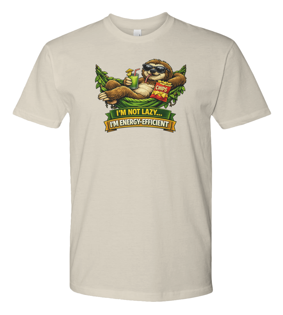 Embrace your inner sloth with this incredibly comfortable and stylish tee! Featuring a hilarious graphic of a relaxed sloth lounging in a hammock, complete with sunglasses, a refreshing drink, and a bag of chips, this shirt proudly declares, "I'm Not Lazy... I'm Energy-Efficient."