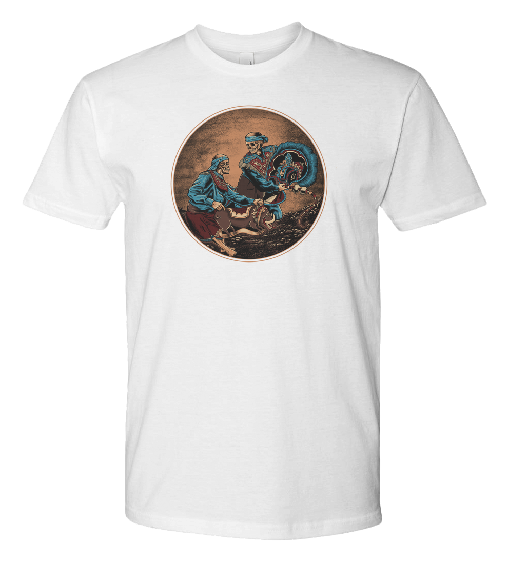 An intricate illustration depicting two skeletal figures performing the traditional Indonesian dance, Jaranan (or Kuda Lumping). One figure holds the iconic woven horse prop (Kuda Kepang), while the other interacts with the mystical boar figure (Celeng). The artwork features a vintage, woodcut-inspired style with stippling textures, framed within a classic circular badge. Perfect for apparel design, cultural posters, and folklore-themed art.