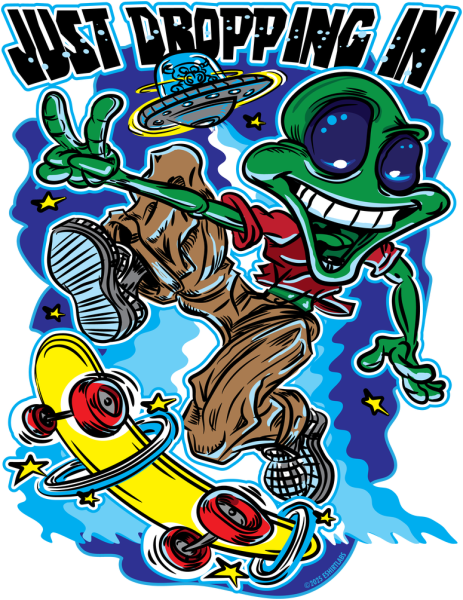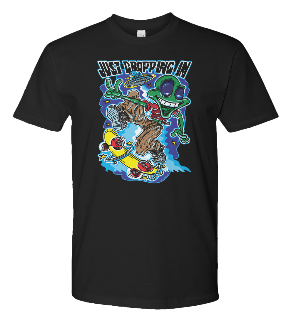 This cosmic skater is "Just Dropping in"... Literally. Featuring a chill alien shredding on a skateboard while flashing a peace/victory sign as a UFO (manned by a Cow) beams down from the stars. It's streetwear meets sci-fi, with a nod to retro skate culture and intergalactic vibes. Perfect for fans of aliens, boards, and out-of-this-world style.