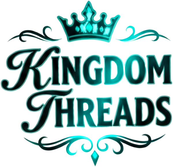 The back features the signature Kingdom Threads branding. A bold, stylized "K" topped with a royal crown anchors the design, spelling out "Kingdom Threads" in the matching teal colorway to tie the whole look together.