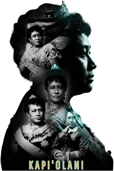 The centerpiece is a striking, high-contrast monochrome silhouette of Queen Kapiolani. Using a dramatic double-exposure cinematic style, her profile is filled with the scenes of her lasting legacythe Kapiolani Maternity Home and the institutions she built to care for the lhui. The design is accented with electric teal highlights, giving it a modern, emotional vibe that pops against the black fabric.