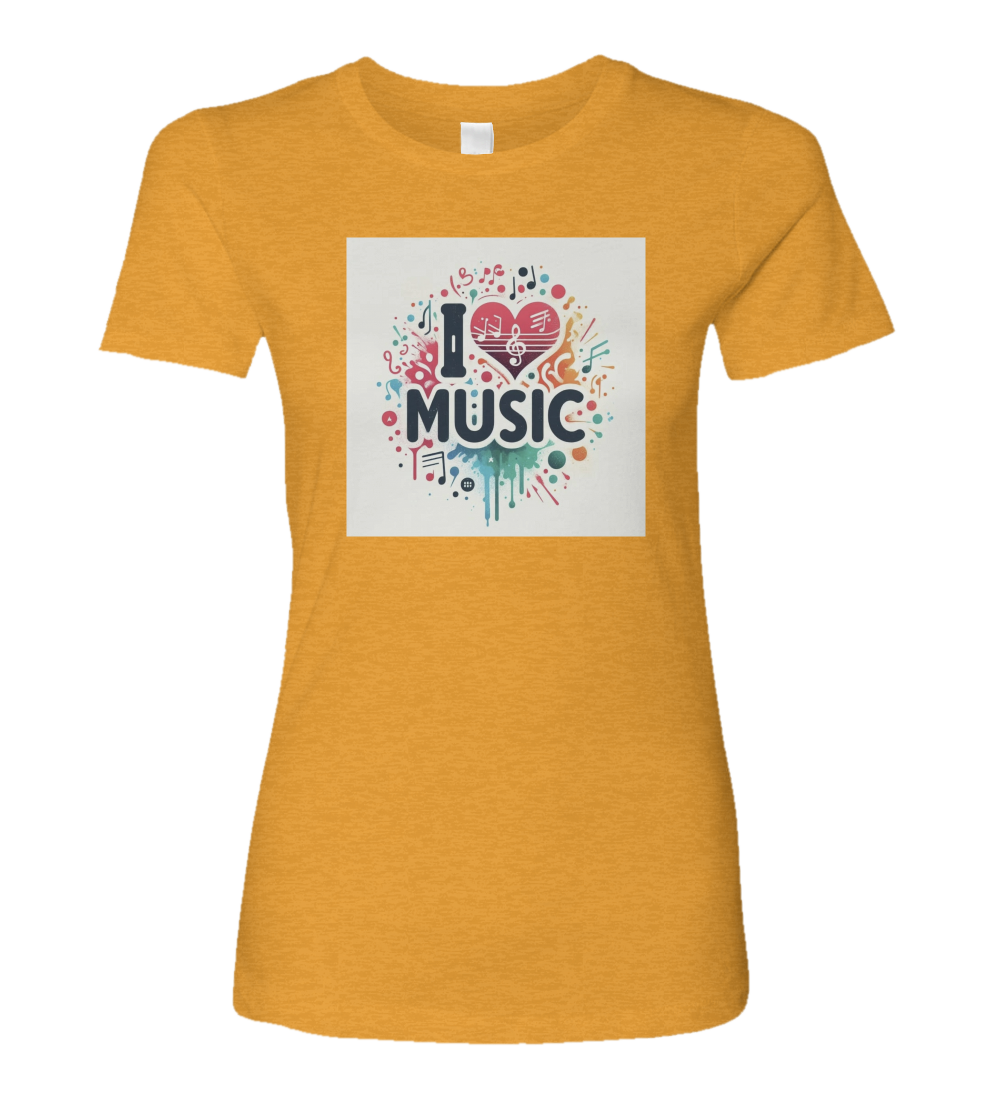 Show off your love for music with this stylish and trendy ladies t-shirt! The design features a bold and eye-catching "I love music" slogan, perfect for music enthusiasts and fashion-forward individuals alike. Made from high-quality, soft fabric, this t-shirt is not only comfortable to wear but also durable, ensuring that you can rock out in style for years to come.
