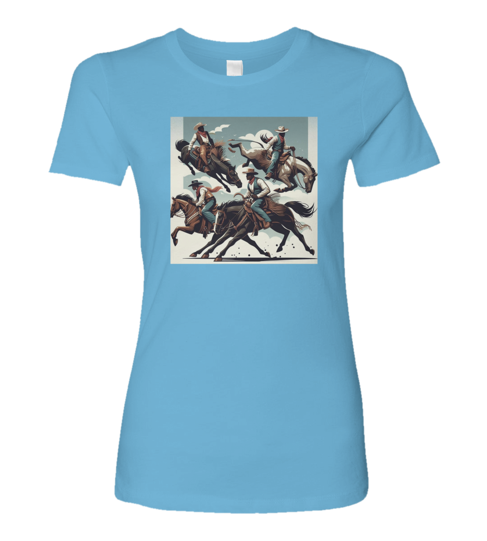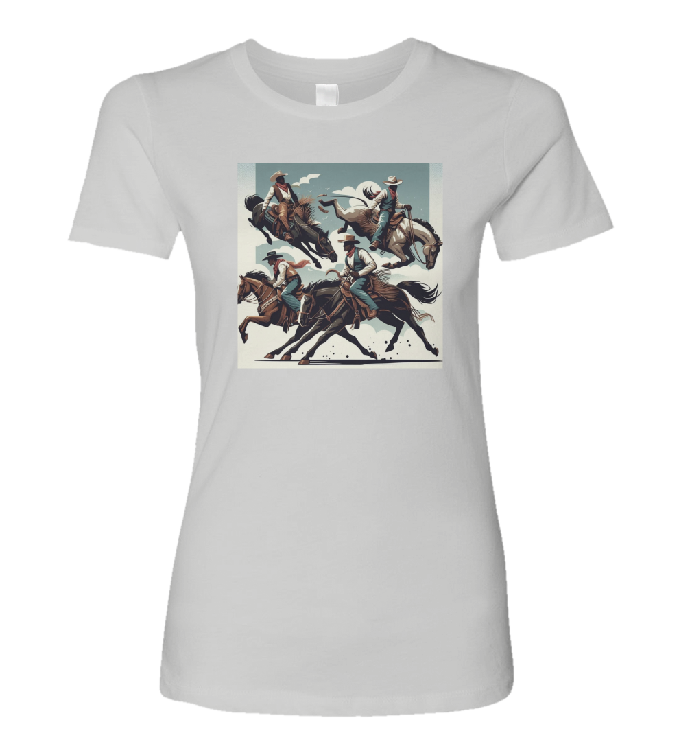 Introducing the Ladies Rodeo Sport T-Shirt, a must-have for all rodeo enthusiasts and fans of the thrilling sport. This stylish and comfortable t-shirt showcases a captivating image of rodeo riders fearlessly riding horses and bulls, capturing the essence of the adrenaline-fueled action. Crafted with the highest quality materials, this t-shirt offers a perfect blend of durability and softness, ensuring long-lasting comfort. The vibrant colors and intricate details of the design make it a standout piece, allowing you to proudly display your love for rodeo wherever you go. Whether you're a seasoned rider or simply appreciate the excitement of the sport, the Rodeo Sport T-Shirt is the ideal choice for showcasing your passion and style.