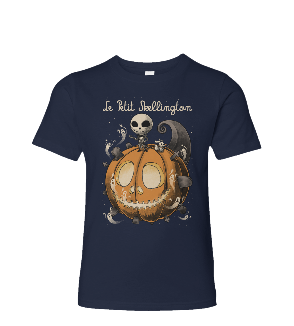 This cute and funny t-shirt is perfect for those who love classic animated movies, stop-motion, and Halloween. Featuring the skeleton Pumpkin King in a cemetery with his ghost dog, surrounded by dead spirits, and the quote "Le Petit Skellington".