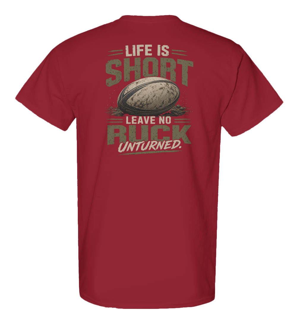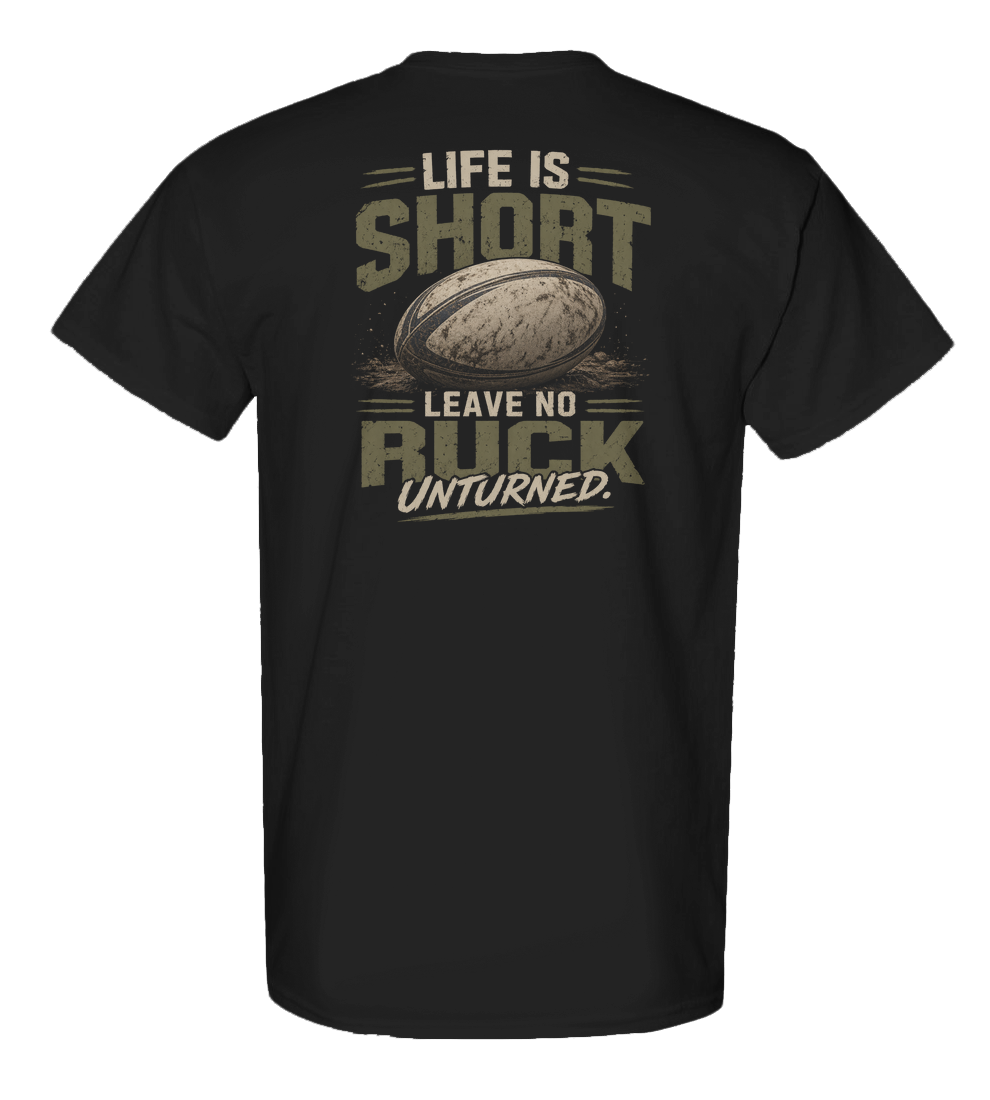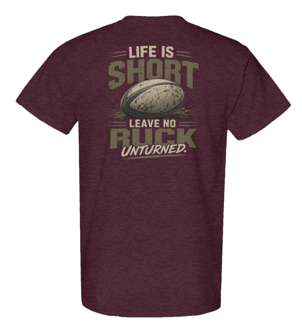 The back design features the bold Leave No Ruck Unturned graphic. It is gritty, relentless, and full of rugby attitude. Centered around a battle worn rugby ball and distressed typography, it captures the spirit of always showing up, putting in the work, and never backing down from a new adventure.