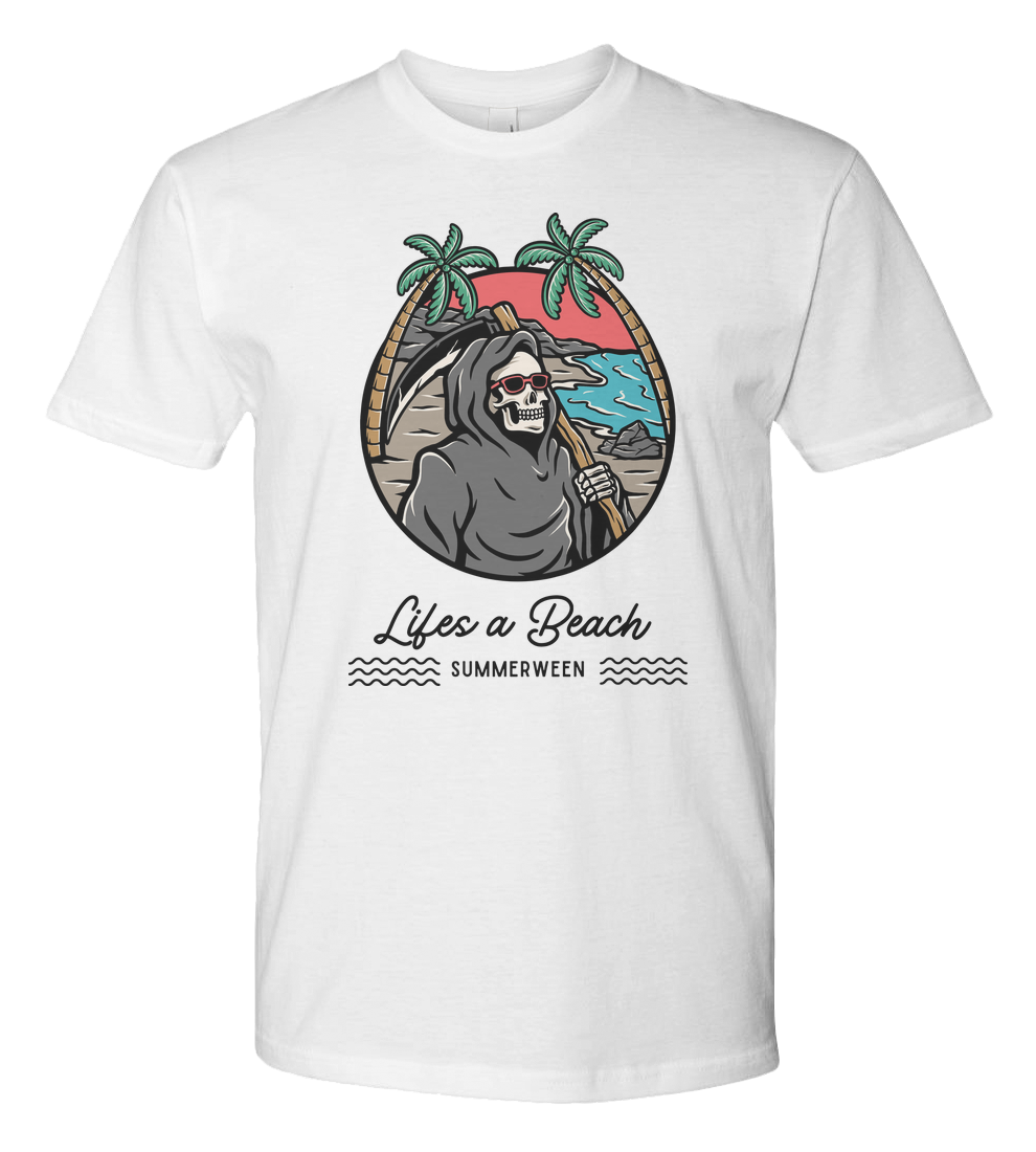 Get ready to raise some hell this summer with our Lifes a Beach, Summerween tee! Featuring a spooky twist on the classic beach vibes, this shirt brings the perfect mix of sunshine and chills. Whether you're soaking up the sun or celebrating the spooky season early, this design will keep you feeling the haunted beach vibes all summer long. Wear it if you dare!