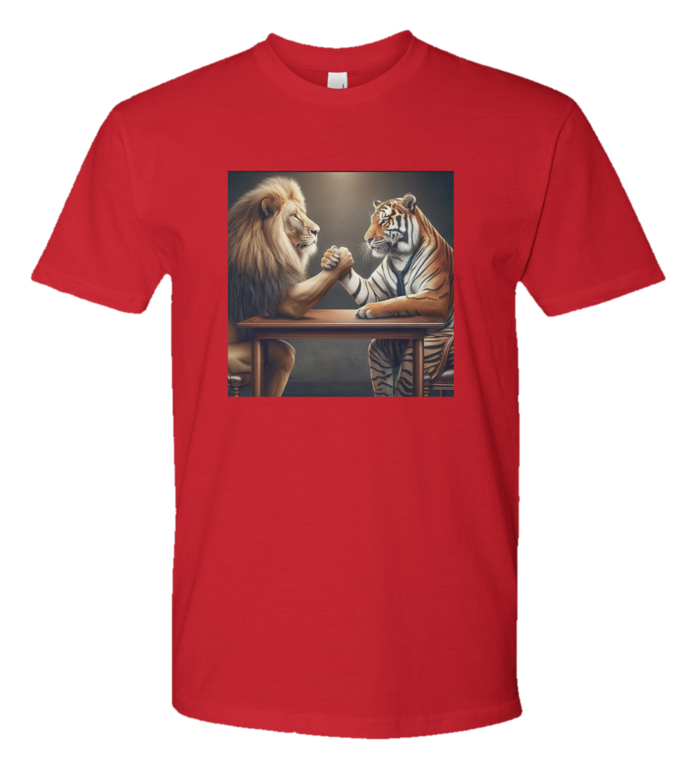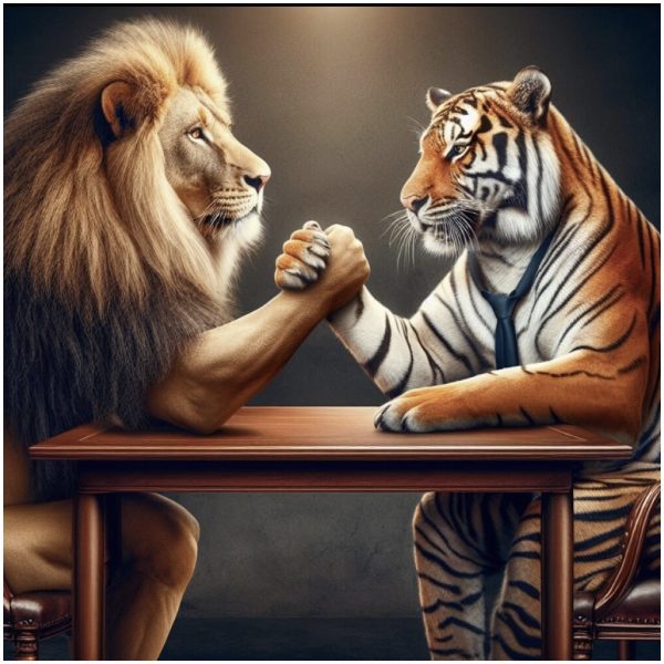 muscles tense, ready to push against each other with all their might. The intensity of the moment is captured perfectly in the way their eyes are locked on each other, determination shining through.
