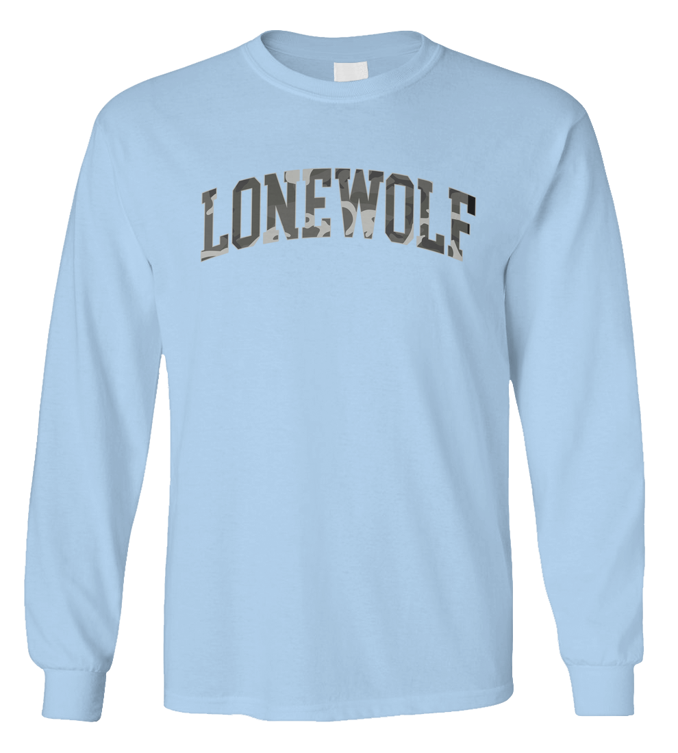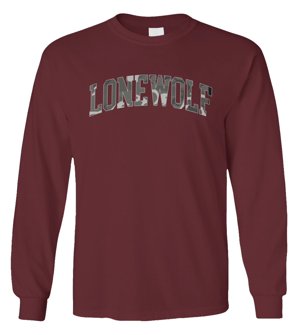 The brand name "Lonewolf" has a slightly arched form. The lettering is infused with a camouflage print to give it a military vibe.