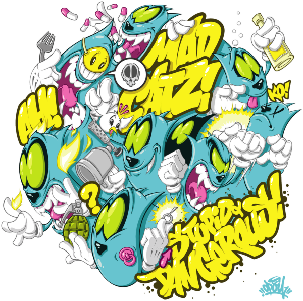 My first design with my MADCATZ, little cartoon cats I created. A bit disturbed and restless, but not really mean...