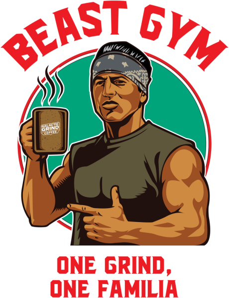 Featuring a tough, determined warrior raising his morning brew with a thumbs-up, this design honors the bond between hard work and the brotherhood/sisterhood that forms inside the gym.
