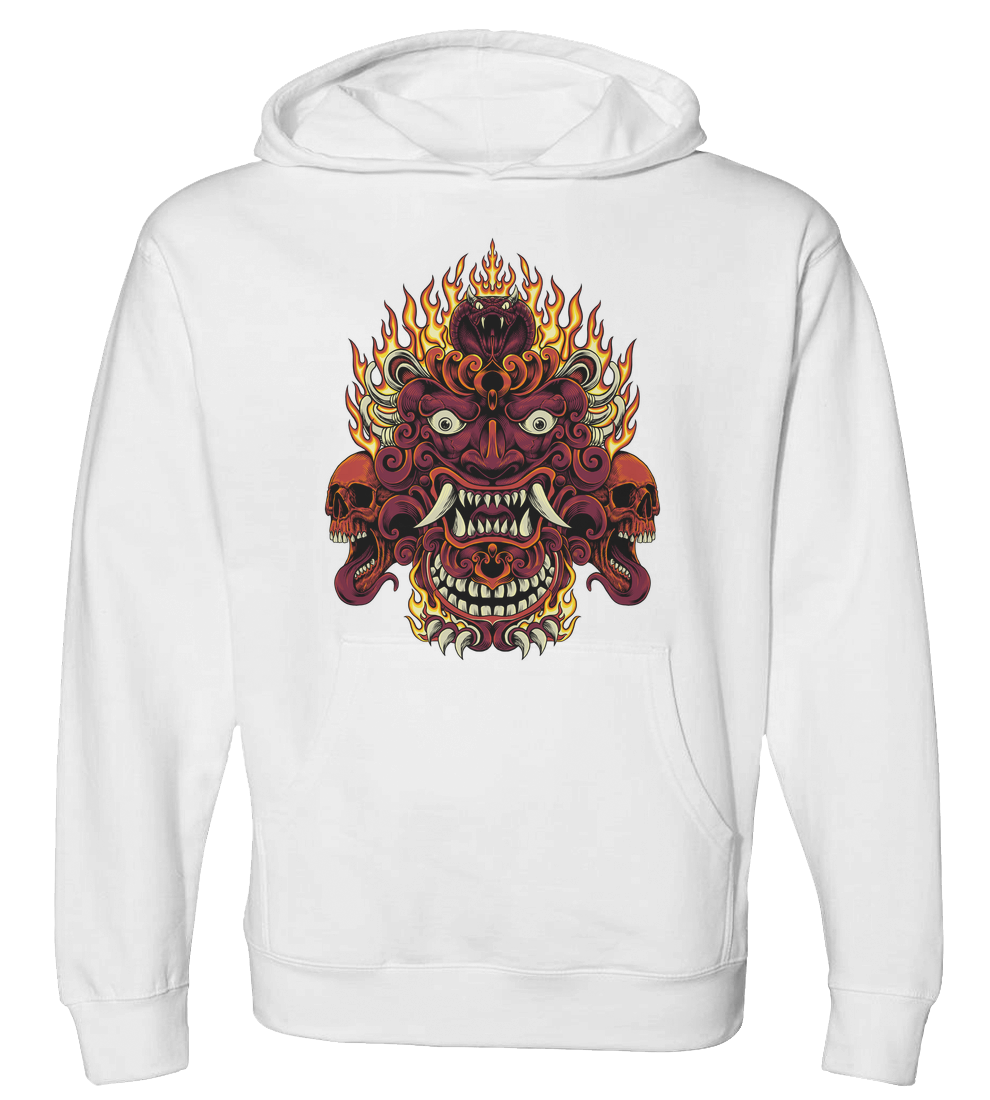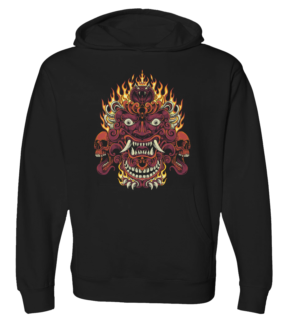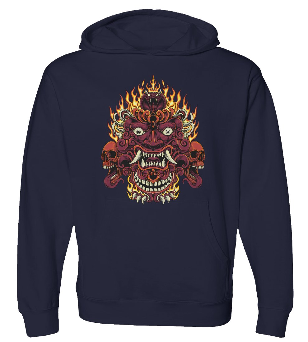 Oni mask with two skulls emitting fire