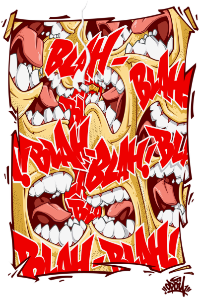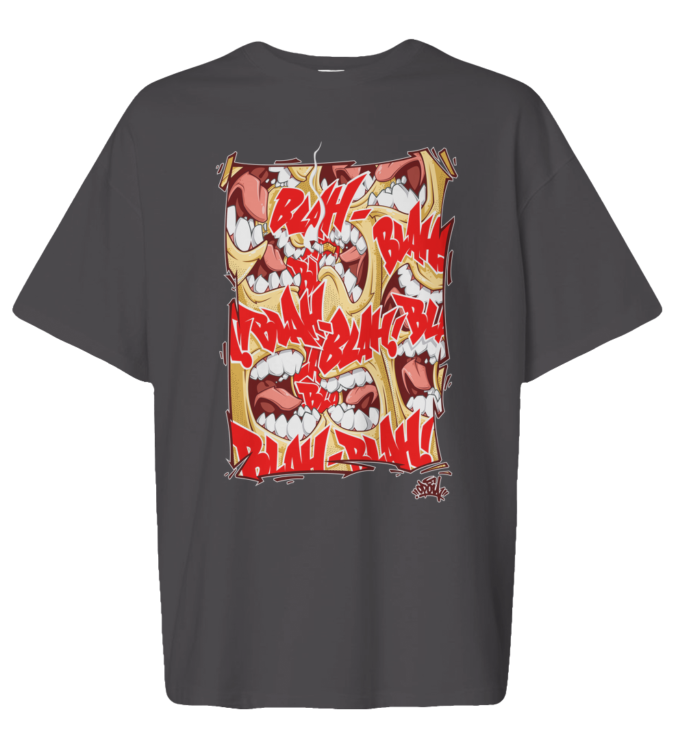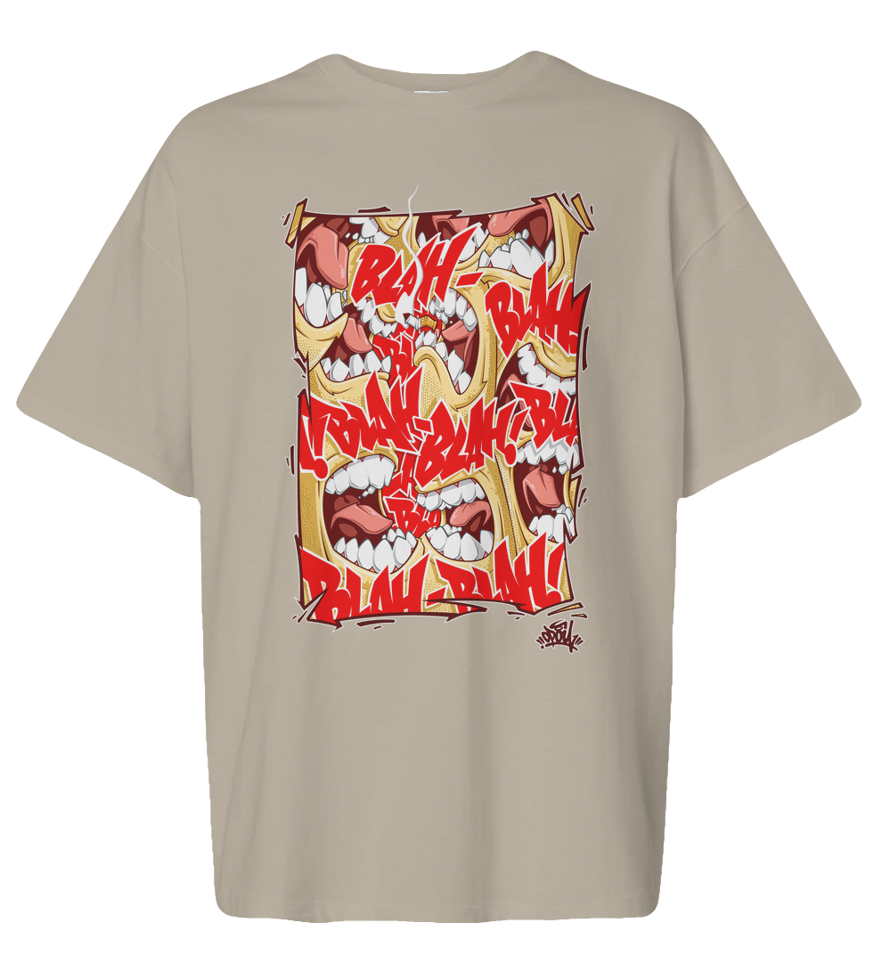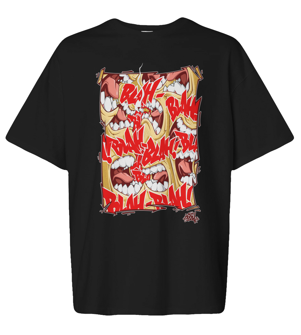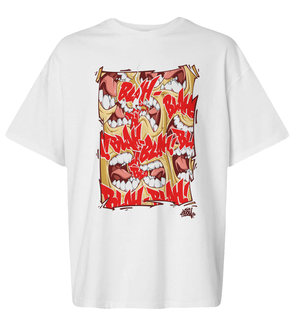Hi! Im the French graffiti artist OPOIL. Here is my first T-shirt, BLAH-BLAH.An illustration about all those people who talk too much the followers of much ado about nothing.