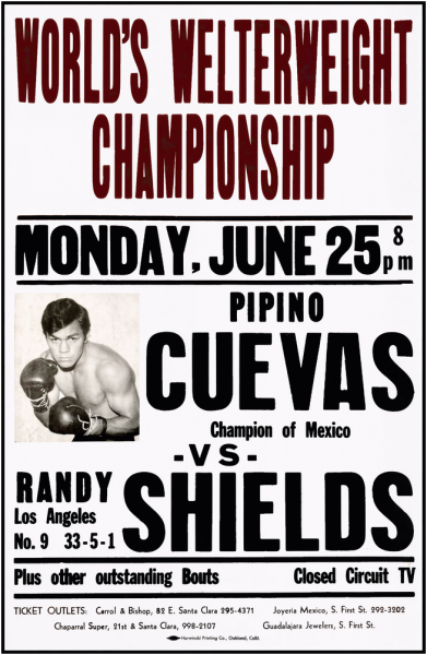 Pipino Cuevas at 147 lbs met Randy Shields at 142 lbs on July 30th 1979 at The International Amphitheatre in Chicago, Illinois for The WBA World Welterweight Title which was the 9th title defense by Cuevas.
