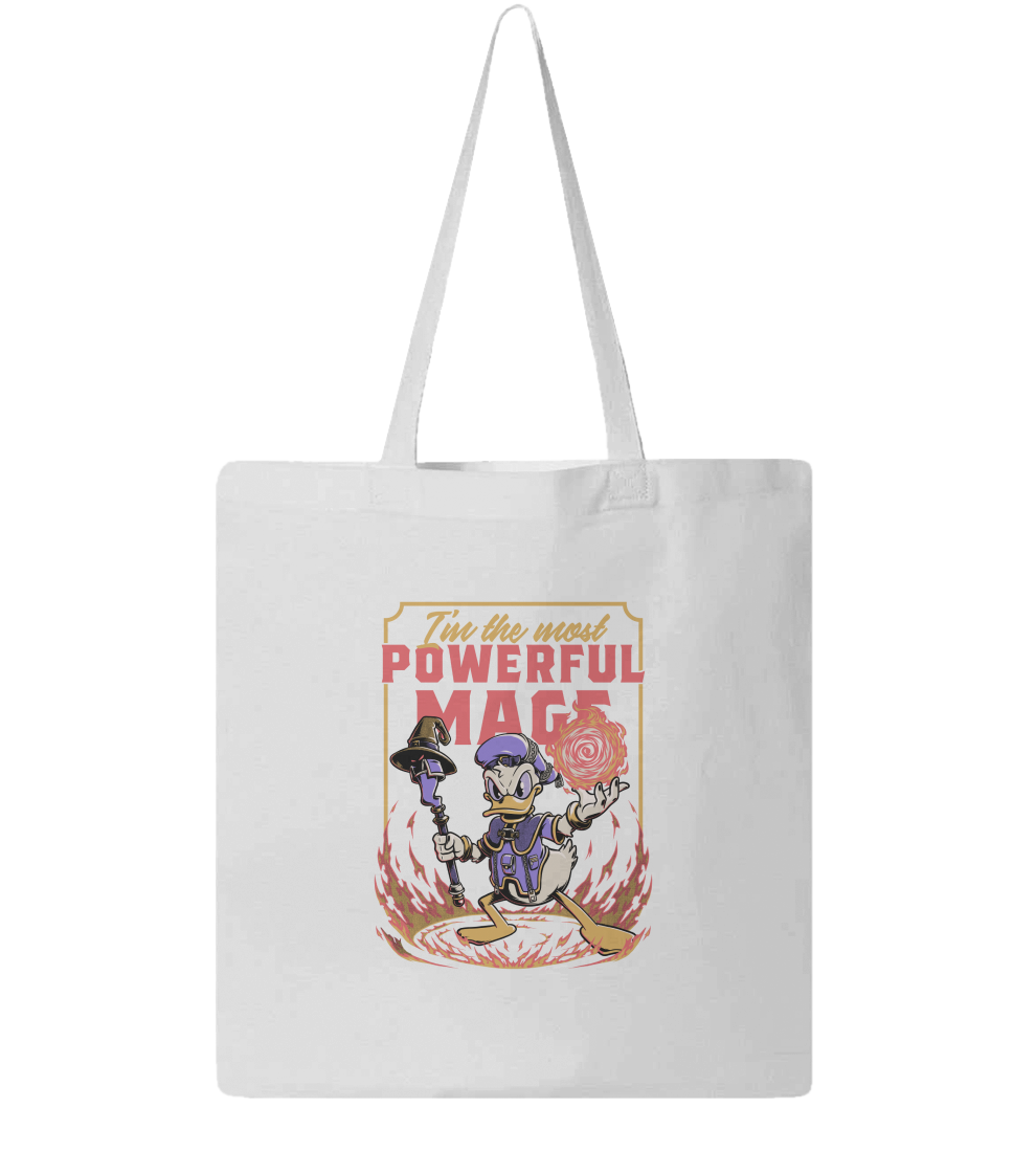 This cool, funny, and awesome t-shirt is perfect for those who love RPGs, fantasy, adventure, and video games. It features a duck wizard conjuring a fireball with the quote "I'm the most powerful mage".