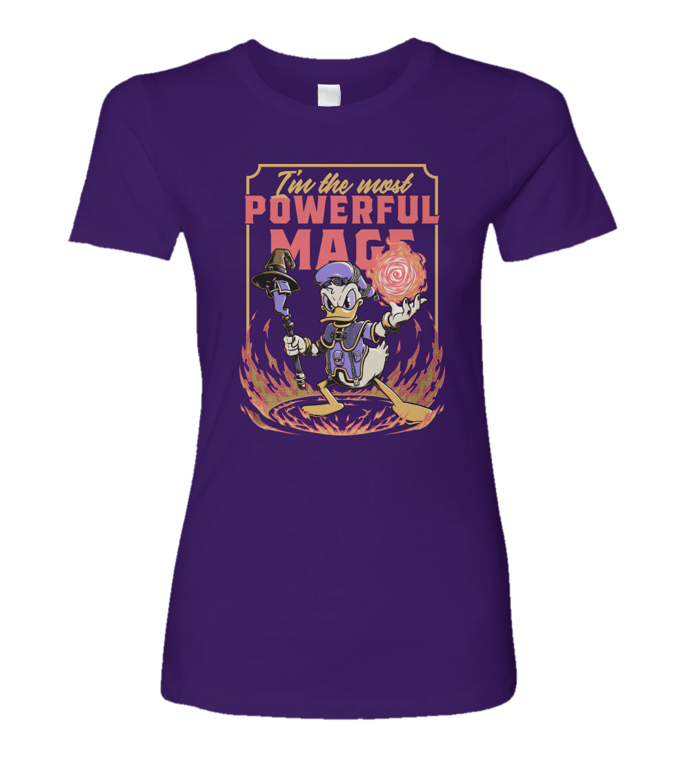 This cool, funny, and awesome t-shirt is perfect for those who love RPGs, fantasy, adventure, and video games. It features a duck wizard conjuring a fireball with the quote "I'm the most powerful mage".