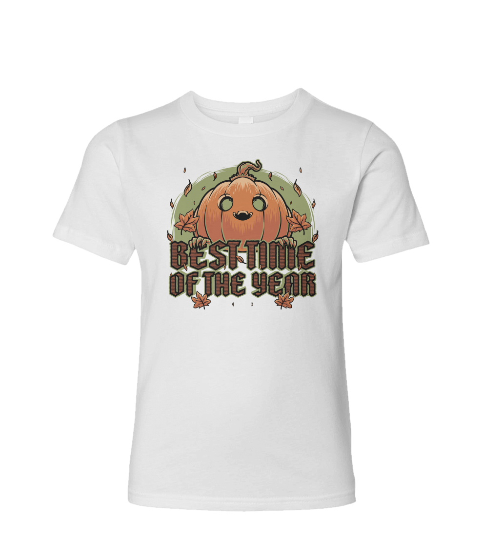 This cute and funny t-shirt is perfect for those who love Halloween, autumn, fall, October, and the spooky season. Featuring an adorable carved pumpkin smiling and surrounded by falling leaves, with the quote "Best Time of the Year".