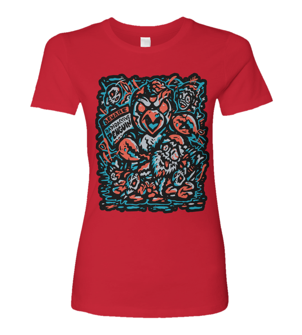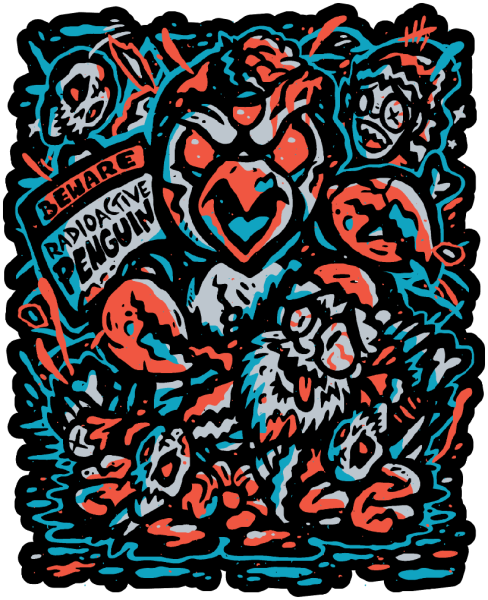 Radioactive penguin with spider's leg & crab's arms and eating Santa Claus & elves