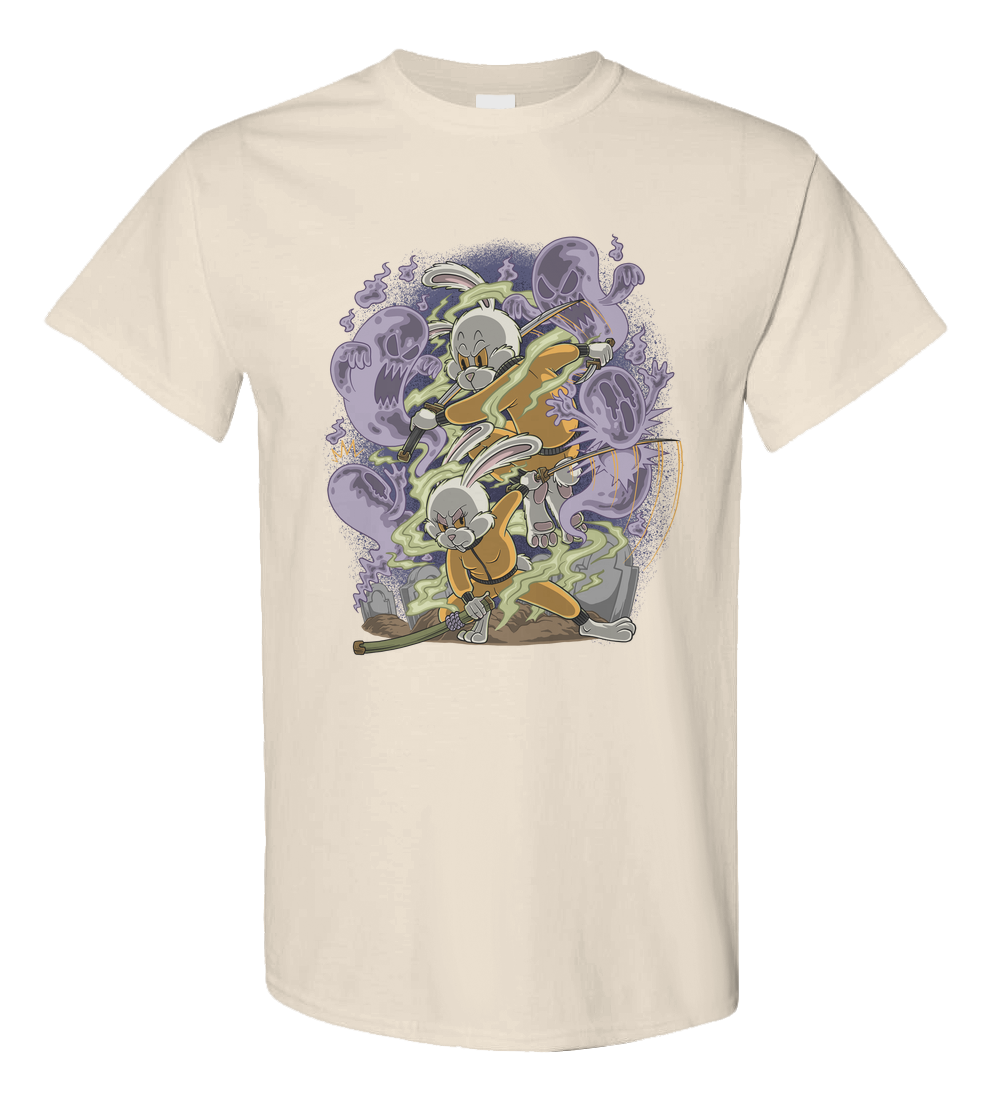 A fierce retro-style bunny warrior battles spooky purple ghosts with twin swords, surrounded by swirling energy and graveyard vibes. Dynamic, bold, and perfect for fans of action-packed cartoon art.