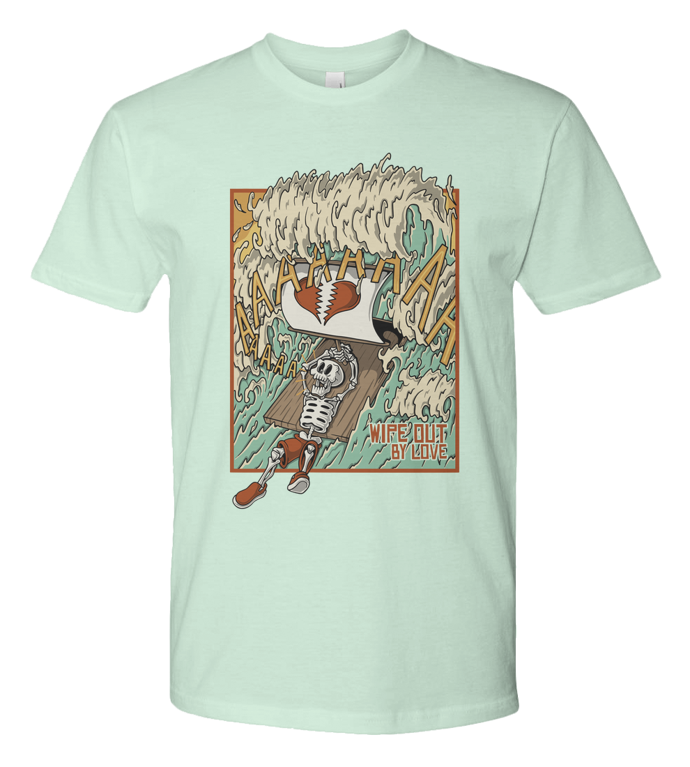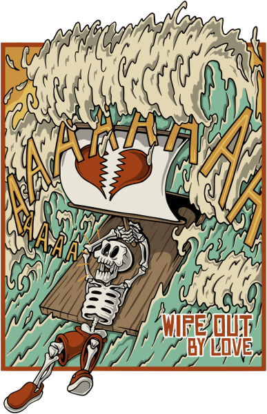 Retro cartoon illustration of a skeleton surfer getting wiped out by a massive wave, holding a broken-heart surfboard. Funny and dark surfing theme with vintage comic style.