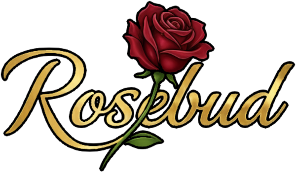 A stylish design featuring the word Rosebud in dynamic script font, paired with a detailed illustration of a red rose.