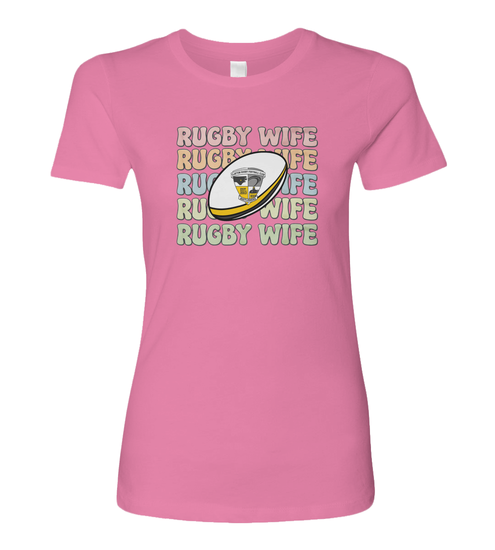 This retro-inspired Rugby Wife design brings bold club pride and vintage flair together in one standout look. Featuring stacked, multi-color lettering in soft pastel tones, the design pops with a playful, throwback vibe while staying true to the heart of the game. Front and center, a rugby ball emblazoned with the Clayton RFC crest ties it all back to the Bootleggers, making it clear where your loyalty lies.