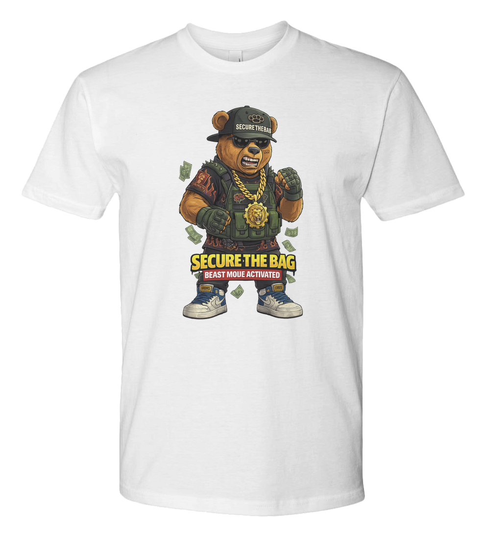 Step into full hustle mode with the Secure The Bag Beast Mode Tee, featuring a fierce, streetinspired bear character geared up in tactical drip. From the bold cap and gold chain to the moneyflying energy, this design embodies ambition, power, and an unstoppable grind mentality.