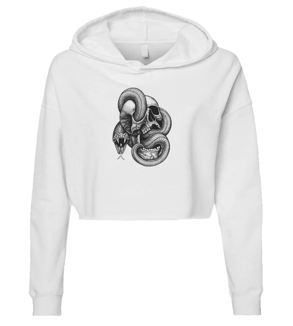 A powerful and dynamic illustration featuring a venomous viper tightly coiled around a weathered, jawless human skull. The snake is depicted mid-strike with bared fangs and a flickering tongue, creating a sense of immediate danger and movement.