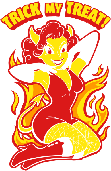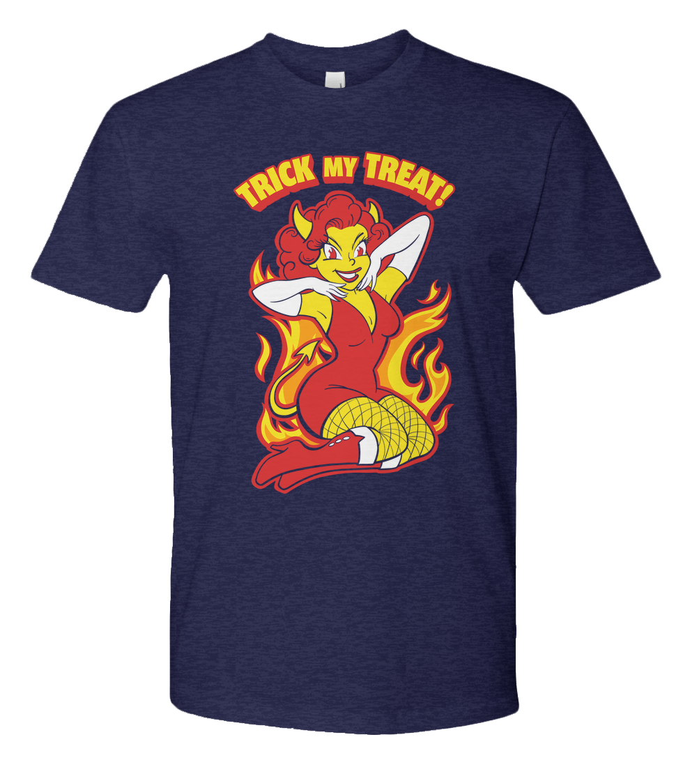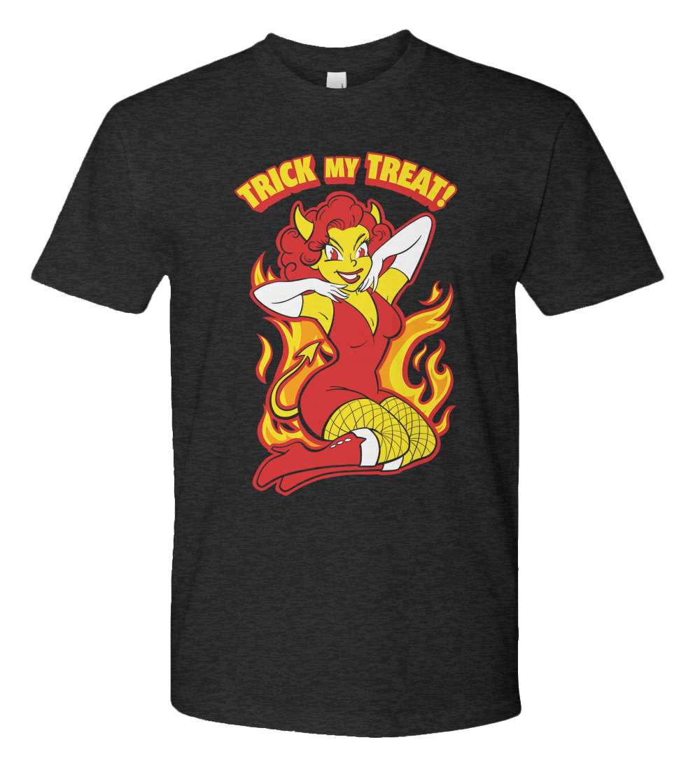 Turn up the heat this Halloween with this fiery Trick My Treat! tee! Featuring a playful retro style devil girl surrounded by flames, this bold design blends vintage pin-up charm with mischievous Halloween fun. Perfect for parties, spooky season lovers, or anyone who likes their style a little wicked. This shirt is guaranteed to make you the hottest treat in town.