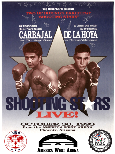 Shooting Stars Boxing Event took place on October 30th 1993. De La Hoya, the East Los Angeles junior-welterweightknocked out veteran Narciso Valenzuela before 18,600 at the America West Arena. On the last fight of the card, Michael Carbajal retained his International Boxing Federation and World Boxing Council light-flyweight title in a furious, fifth-round technical knockout of Domingo Sosa.