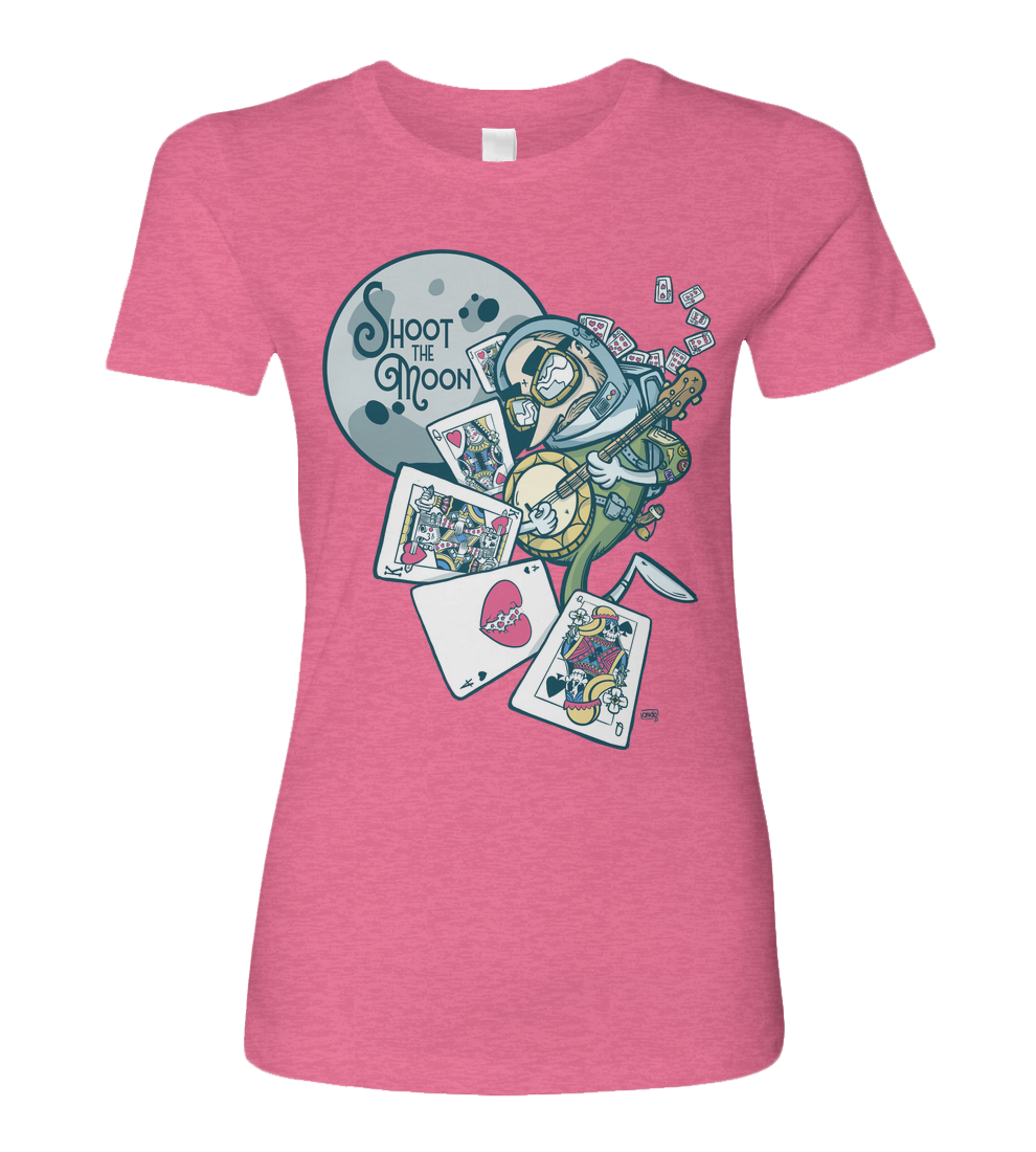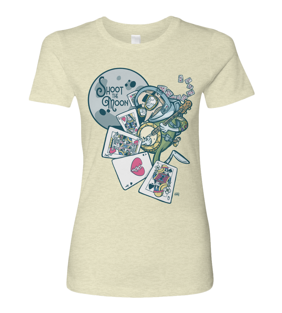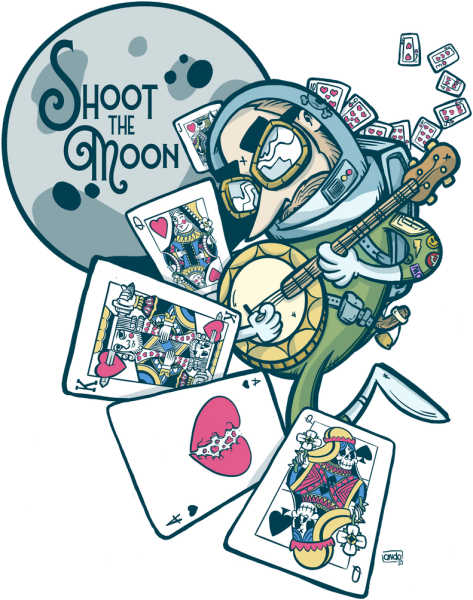 A bold graphic tee inspired by the high-risk, high-reward move in the classic card game Spades shooting the moon. Featuring a space-suit banjo-slinging outlaw blasting past the moon and a trail of broken queens, shattered hearts, and unbeatable hands, this design celebrates the players who dont just play the game they gamble big and go all in.