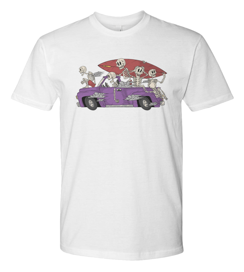 A retro cartoon illustration of skeletons riding in a truck with surfboards, capturing wild surf culture and dark humor.