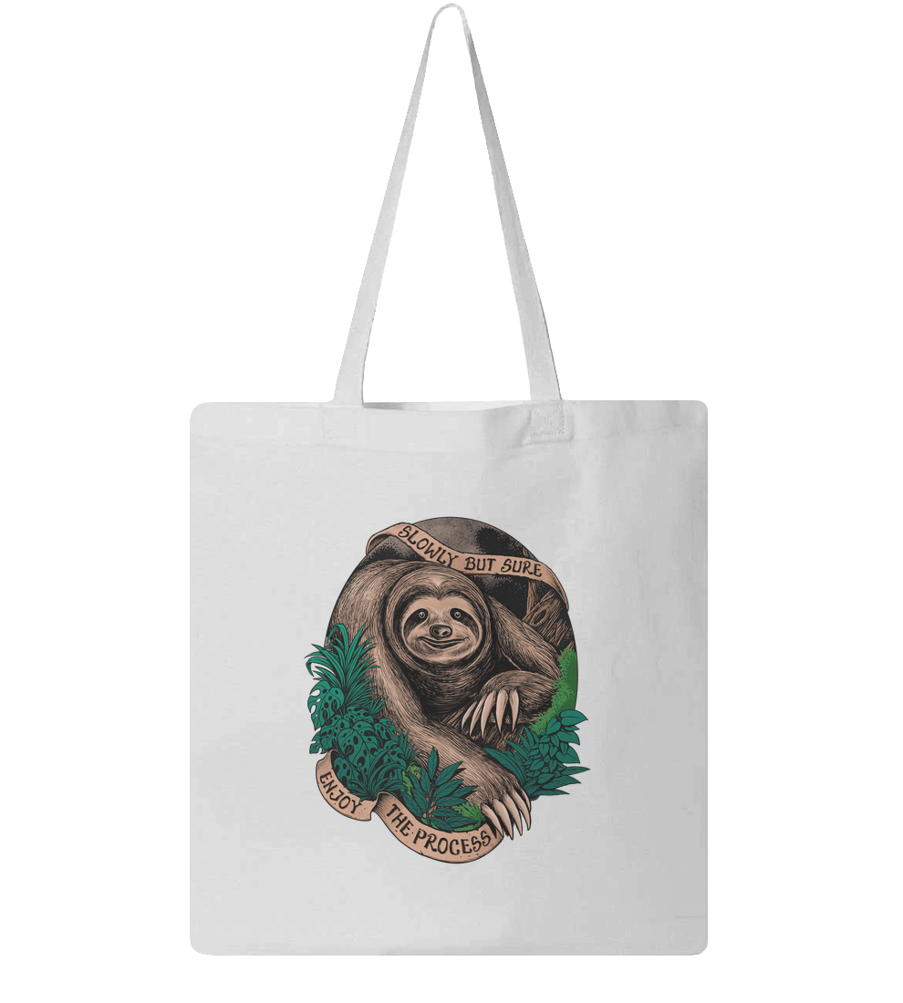 A charming and detailed illustration featuring a smiling sloth nestled among lush tropical monstera leaves and jungle foliage. The design is framed by vintage-style banners carrying the motivational message: "Slowly But Sure" and "Enjoy The Process." Executed in a professional woodcut and engraving style, this piece uses warm earth tones and deep forest greens to create a calm, grounded aesthetic. It's a perfect reminder to slow down, stay persistent, and appreciate the journey. Ideal for fans of nature illustration, cottagecore, and positive mindset graphics