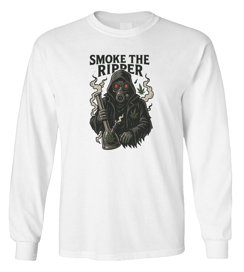 Not all legends haunt some just hotbox.The Smoke the Ripper long sleeve is for the ones who take their mystery with a side of loud. Featuring a masked reaper gripping a bong like its his last mission, this tee brings vintage horror energy with full stoner clarity.