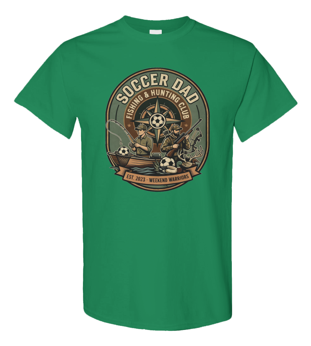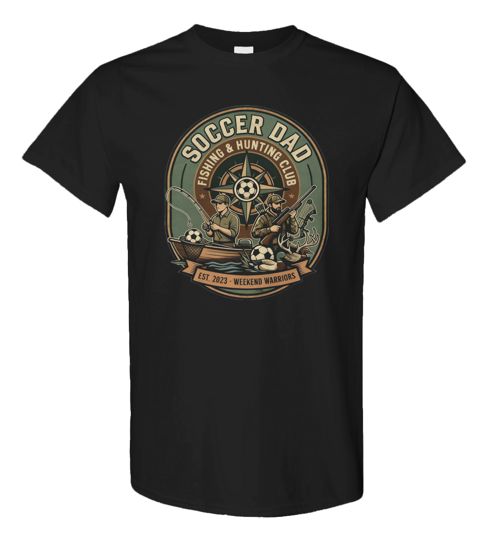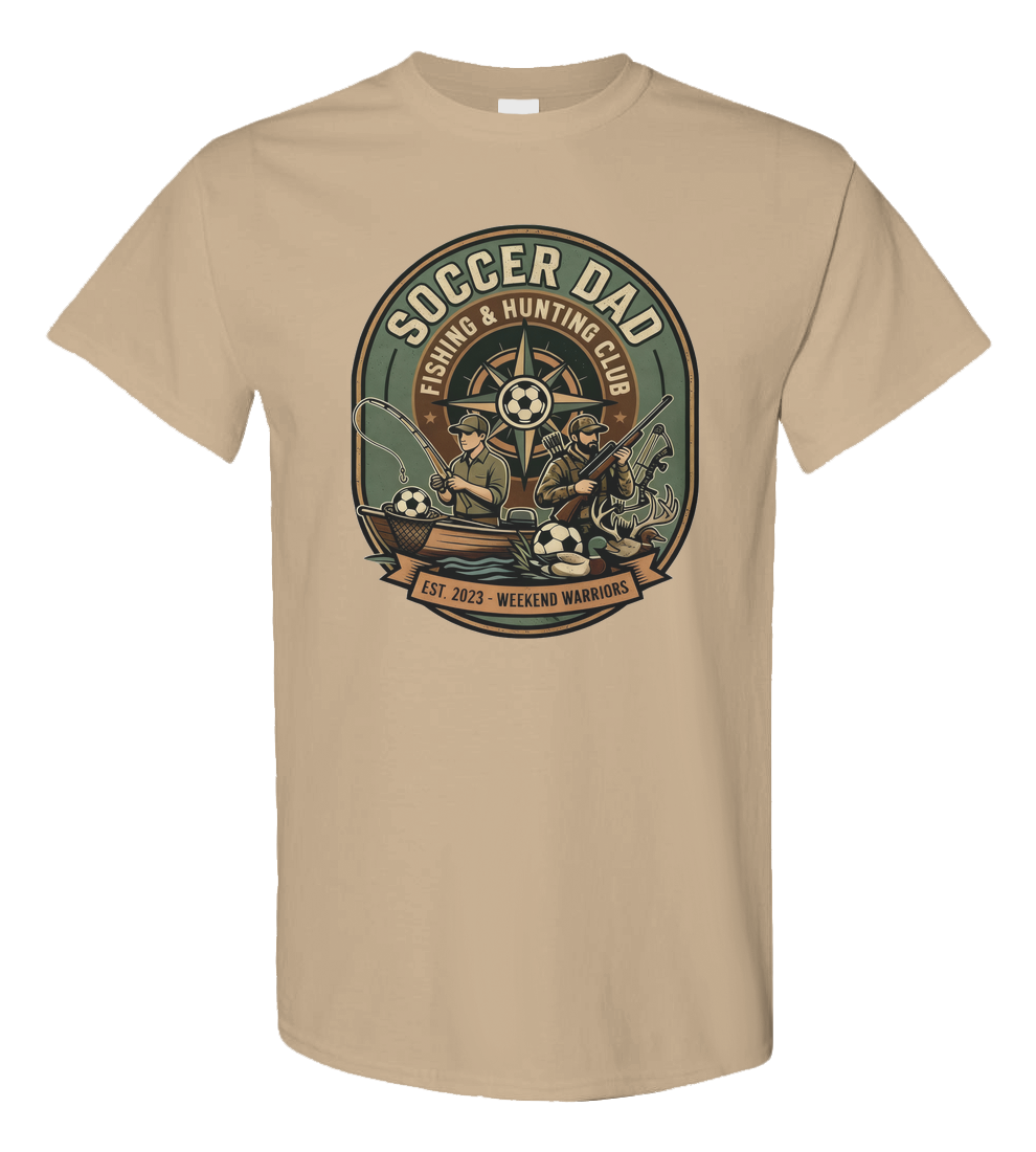 Introducing the "Soccer Dad Fishing & Hunting Club" shirt because being a dad is a sport of its own! Whether you're reeling in the big one or bagging that trophy buck, this heavy cotton blend tee is built to withstand your weekend warrior adventures. Available in tan, green, and black, it's the perfect uniform for dads who dominate both the soccer field and the great outdoors. Show off your dual expertise and let everyone know you're a proud member of the most versatile club around. Get yours today and wear your passions with pride!