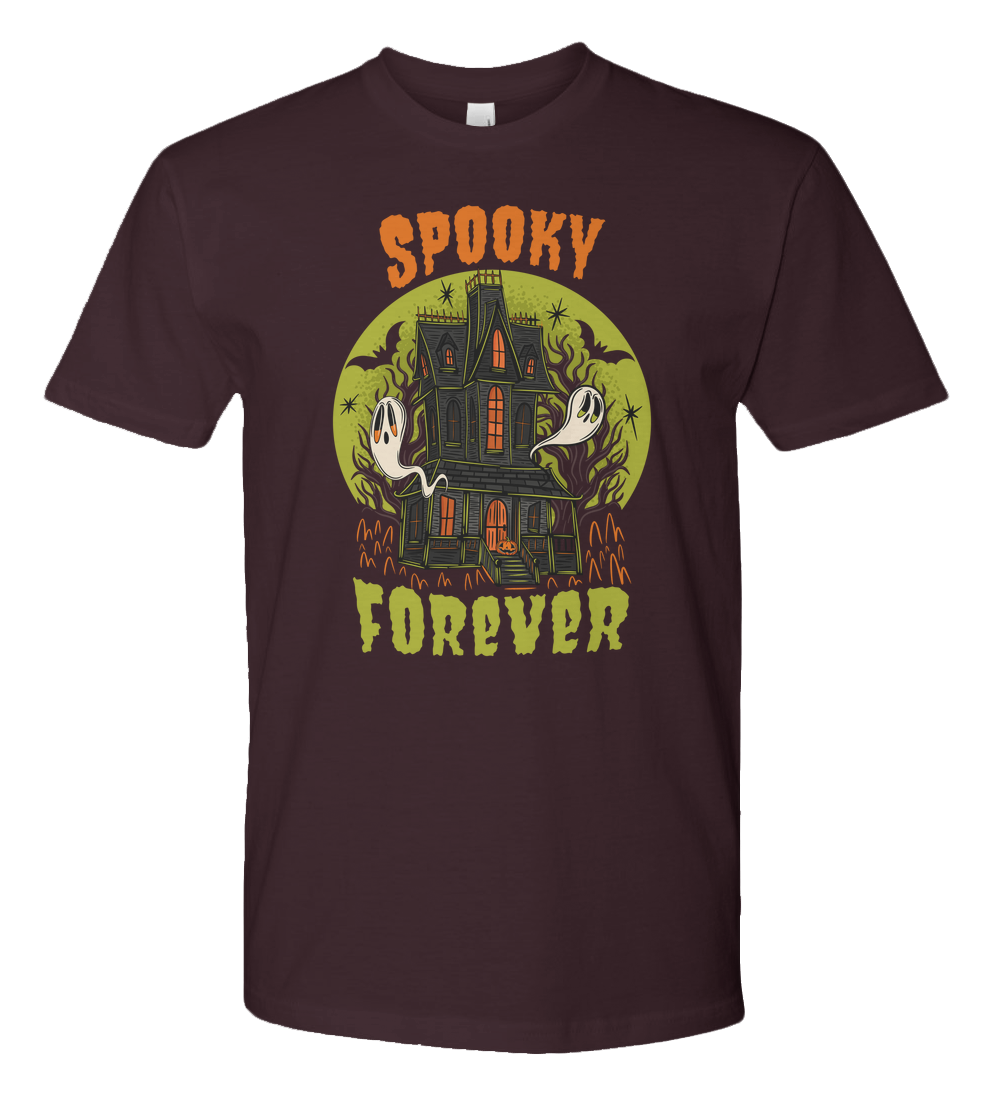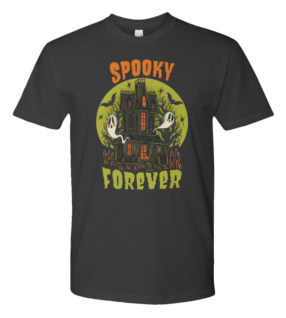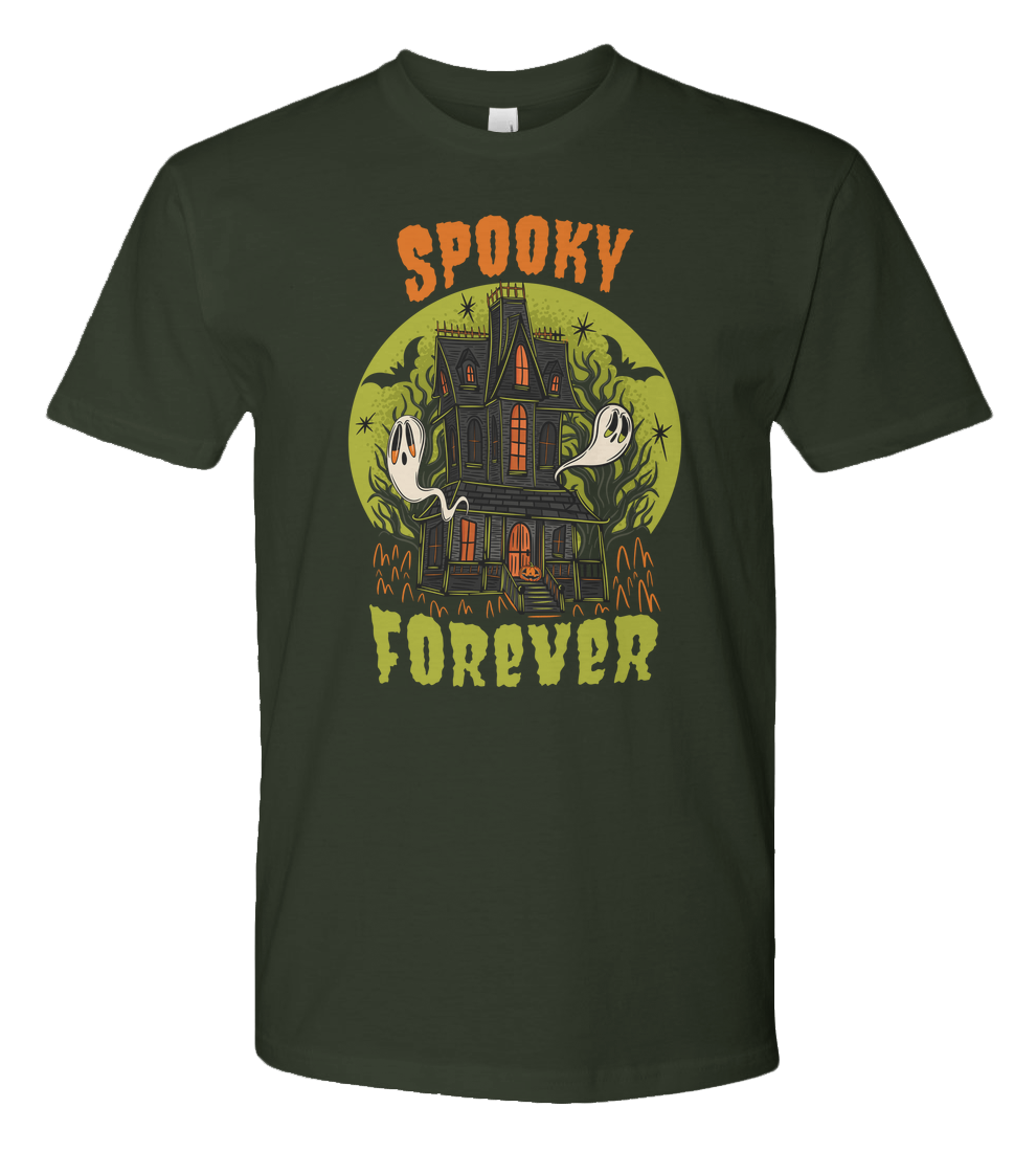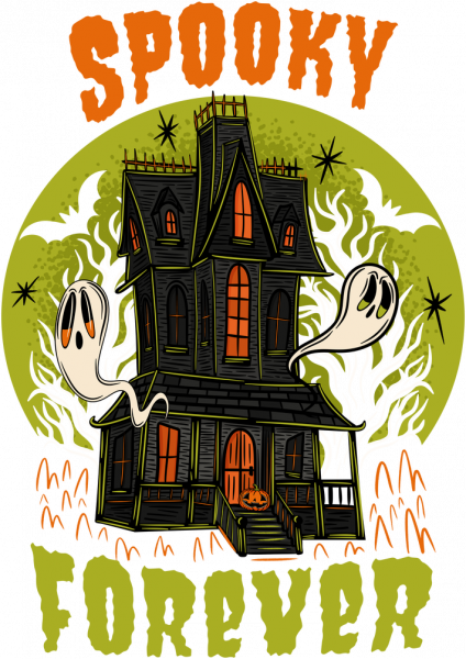 Hand drawn haunted house scene with the typography of Spooky Forever added.