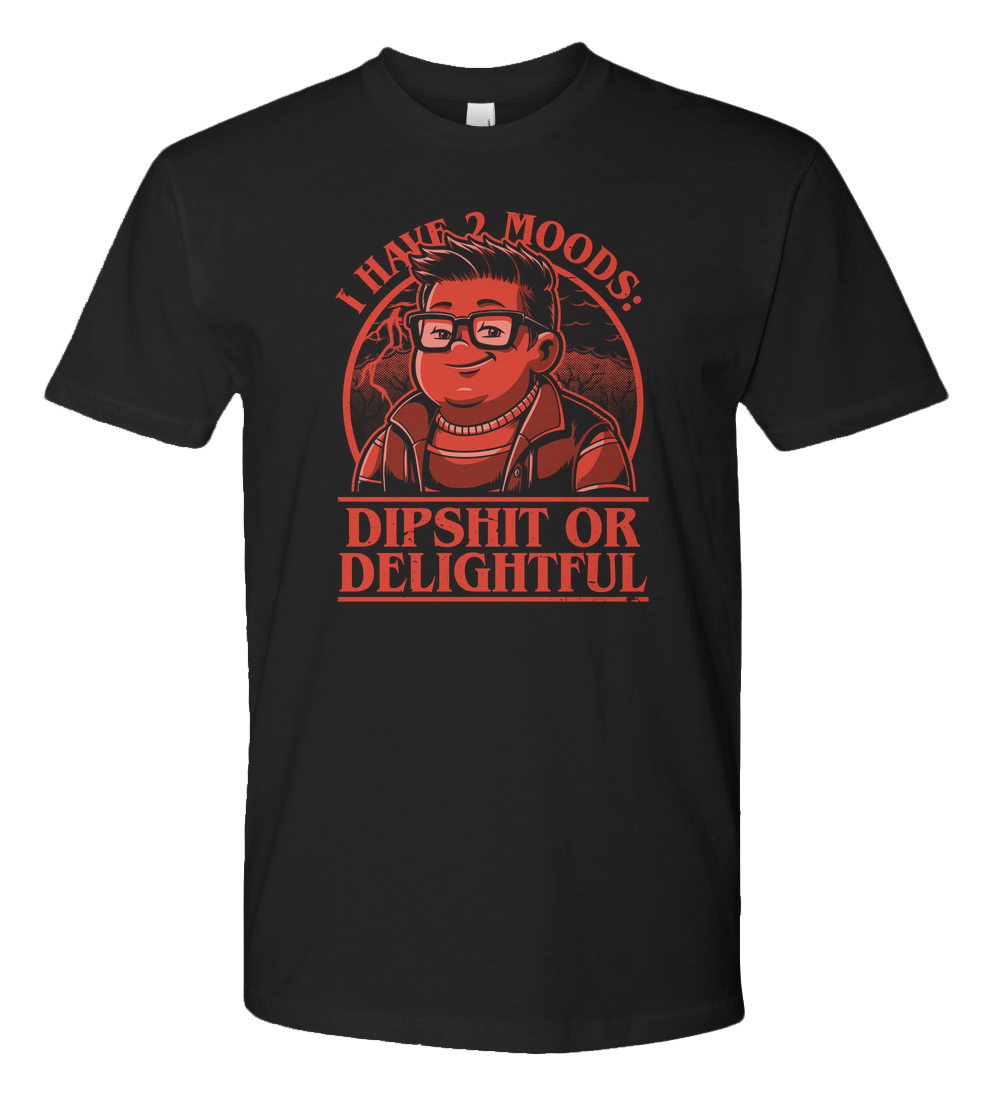 This awesome, cool, and funny t-shirt is perfect for those who love TV Shows, playing RPGs, the 80s, Halloween, retro and vintage movies, classics, and monsters. It features a cute smiling kid with a apocalyptic world behind him, with the quote "I have 2 moods: dipshit or delightful".