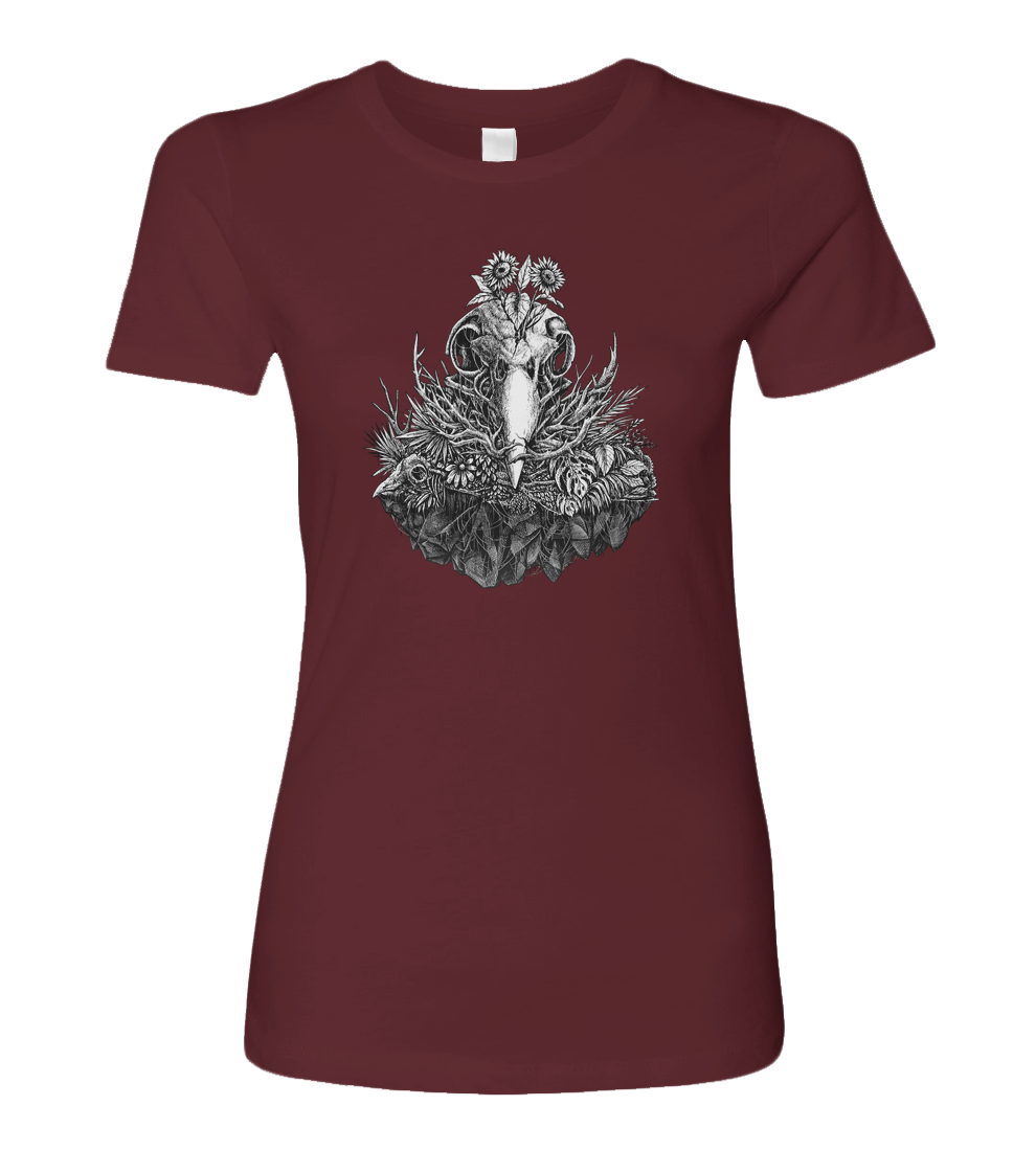Bird skull nest full of twigs and sunflowers growing on the skull
