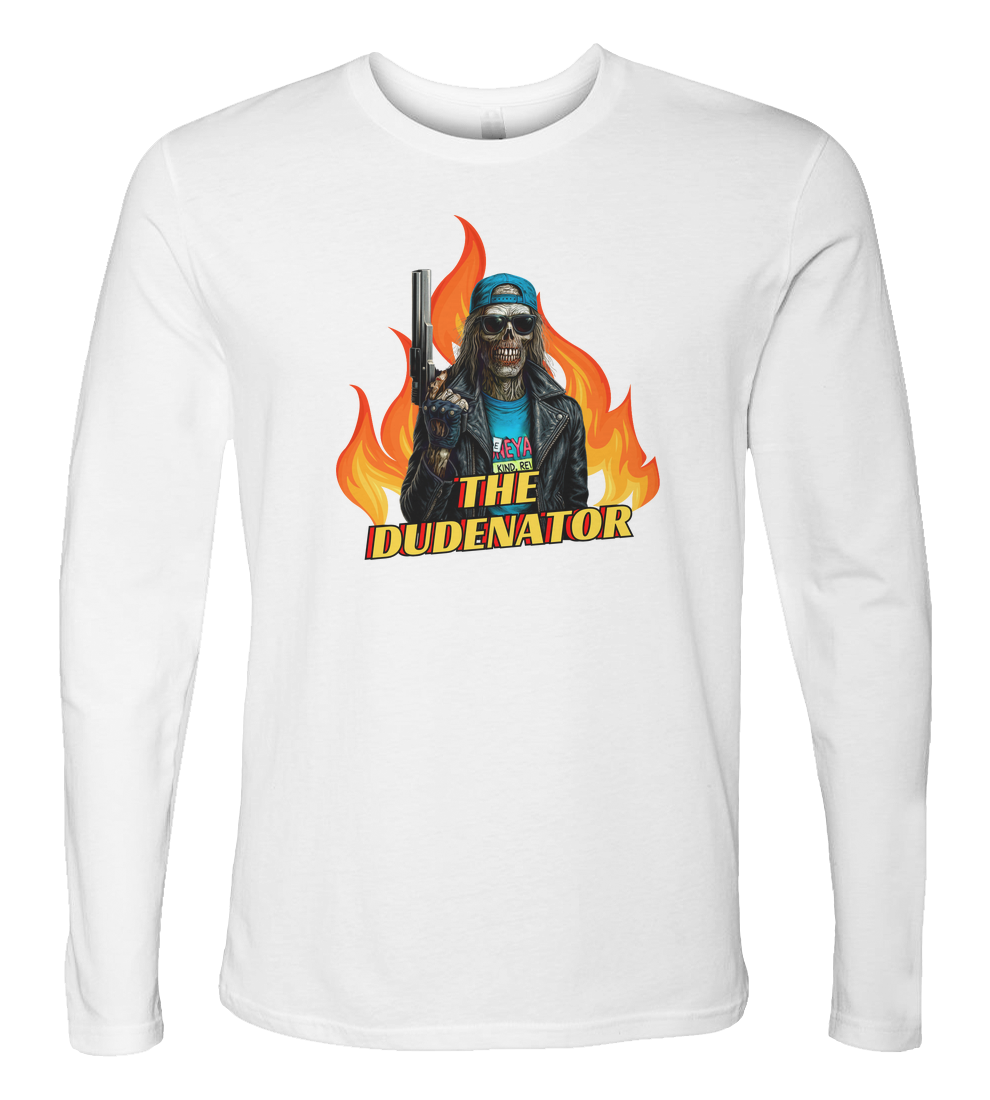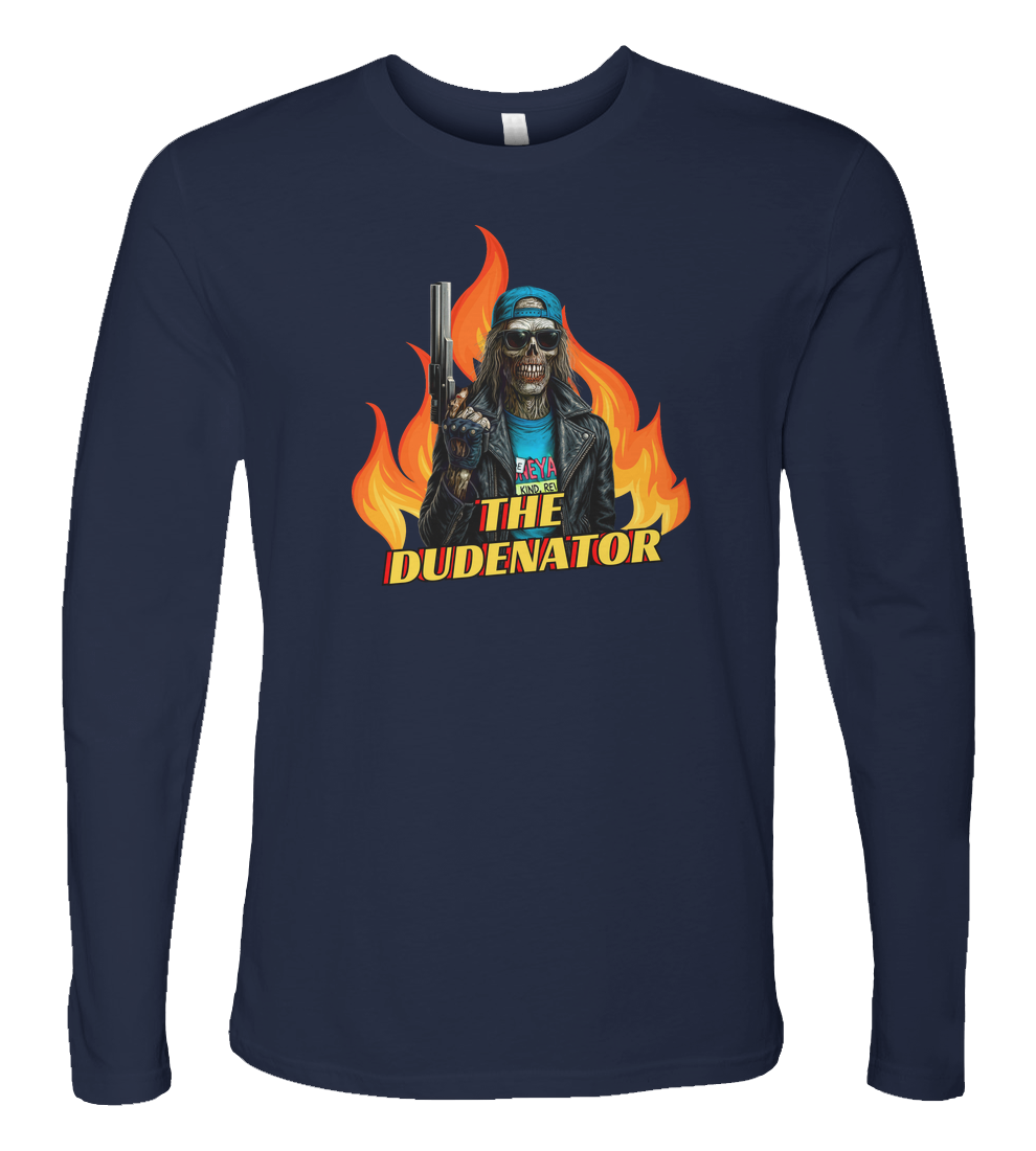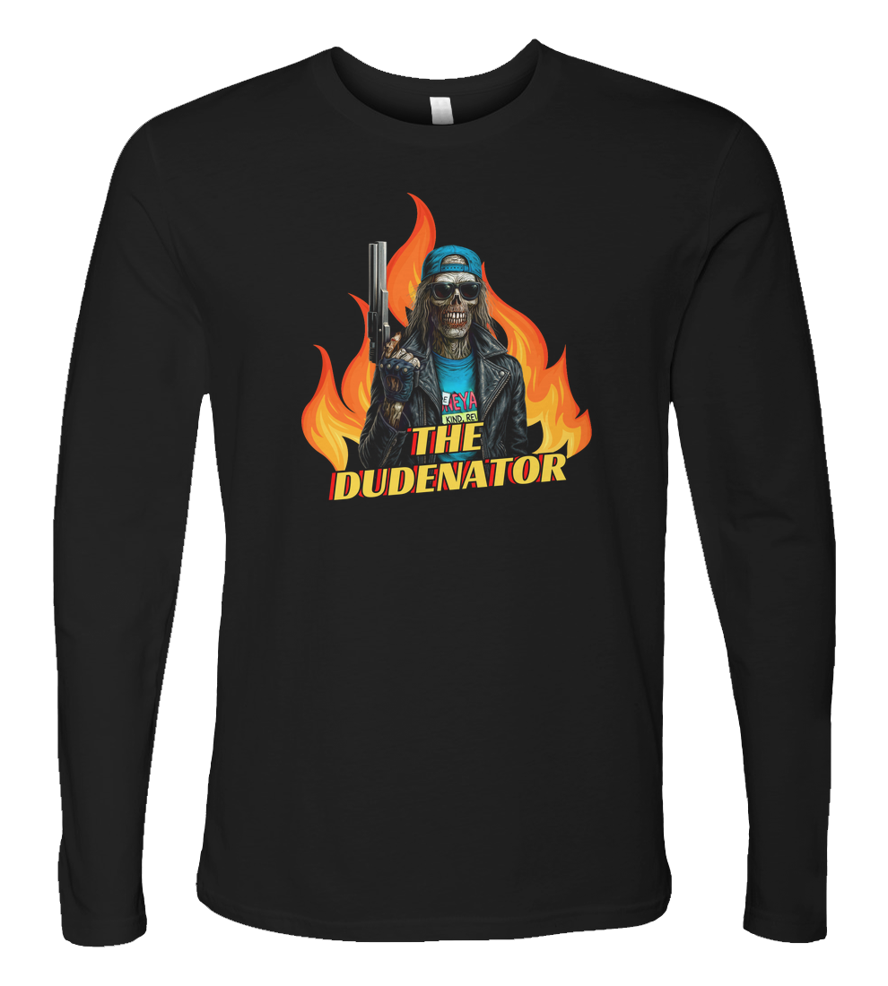 Straight outta the flaming aisles of Boneyard Video comes The Dudenatorhalf skeleton, half VHS clerk, all badass. Rocking a leather jacket, shades, and a be kind, rewind attitude, this undead enforcer is locked, loaded, and ready to rewind your nightmares. Whether you're fighting off time-traveling cyborgs or just dodging late fees, this tee brings 80s action horror straight to your chest.