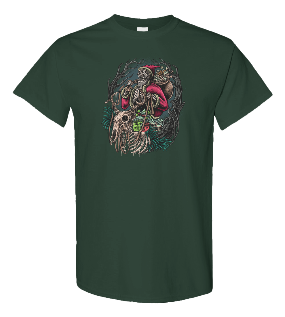Santa Claus is coming to town... from the grave! This dark and detailed illustration features a zombie/skeletal St. Nick in tattered holiday robes, surrounded by dead trees and the bones of his former sleigh team. A perfect alternative design for punk, metal, or horror fans looking to subvert the traditional Christmas cheer.