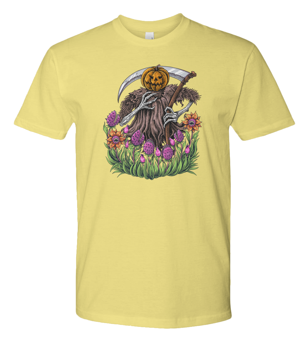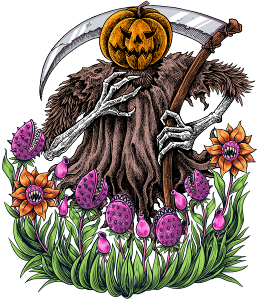An intricate dark fantasy illustration featuring a pumpkin-headed reaper rising from a garden of carnivorous sunflowers and mutated flytraps. This design utilizes detailed cross-hatching and a vivid, high-contrast color scheme to evoke a sense of eerie folk horror. Perfect for streetwear, posters, or horror-themed merchandise