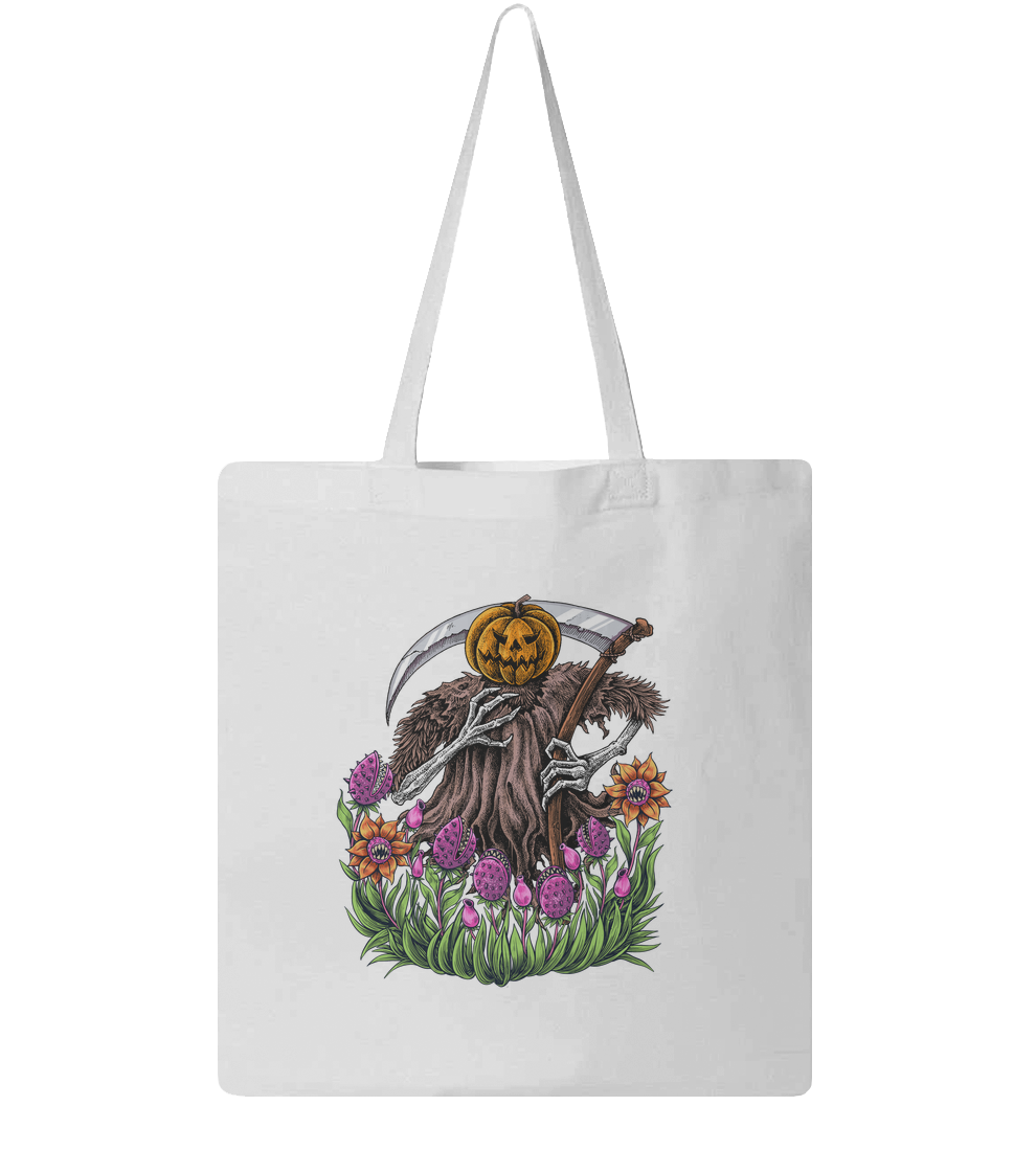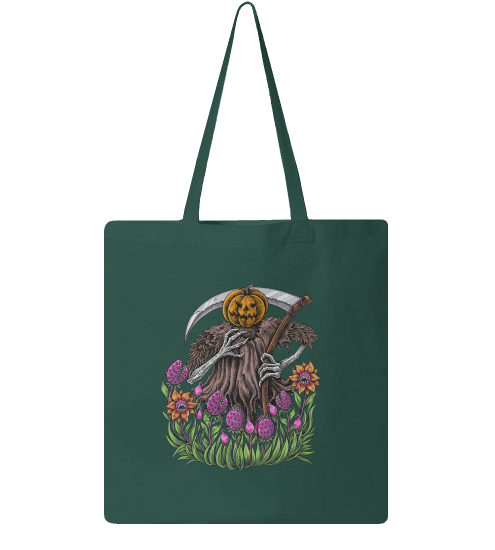 An intricate dark fantasy illustration featuring a pumpkin-headed reaper rising from a garden of carnivorous sunflowers and mutated flytraps. This design utilizes detailed cross-hatching and a vivid, high-contrast color scheme to evoke a sense of eerie folk horror. Perfect for streetwear, posters, or horror-themed merchandise