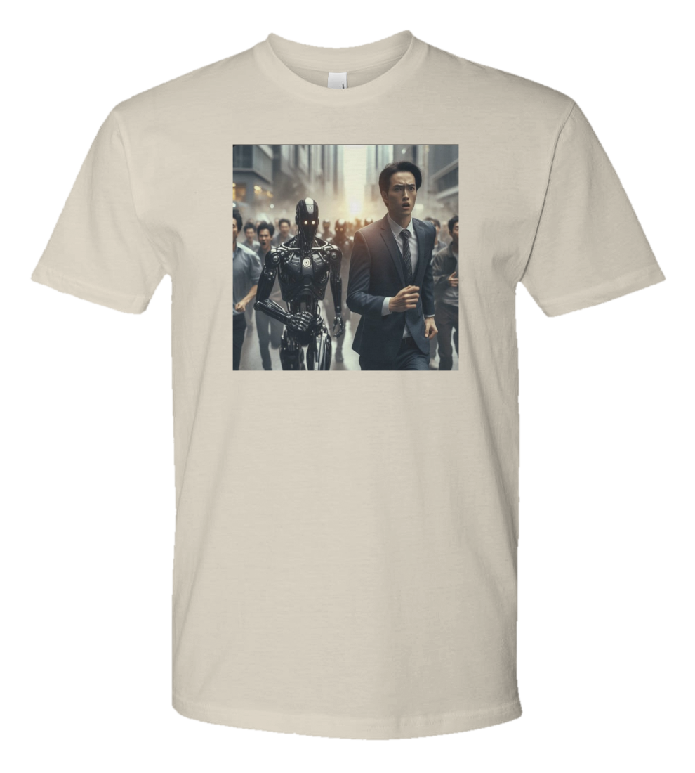 The Rise of the AI Robots t-shirt epitomizes the theme depicted in the image flawlessly. The striking statement emblazoned on the shirt mirrors the escalating impact of artificial intelligence in our society, along with the promising potential for collaboration between humans and robots. The t-shirt's design is sleek and attention-grabbing, boasting a minimalist color scheme that perfectly complements the futuristic concept. It serves as a catalyst for conversation and a bold fashion statement for those captivated by technological advancements.
