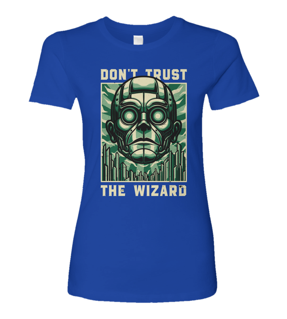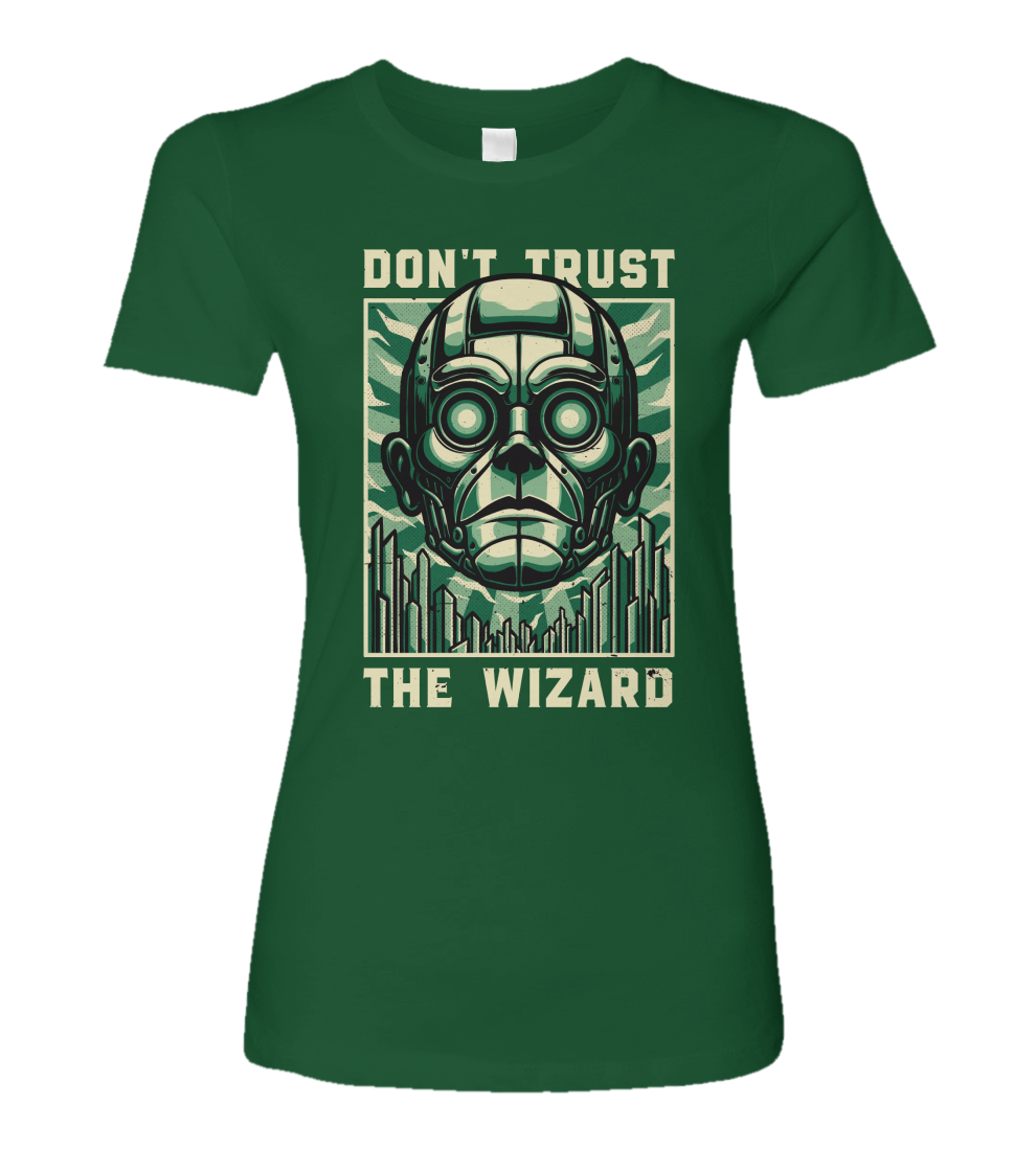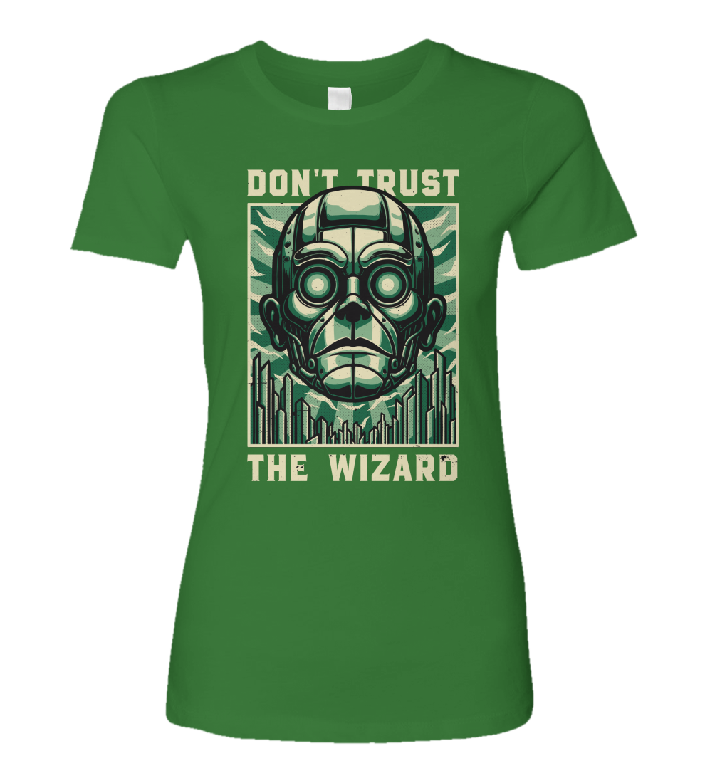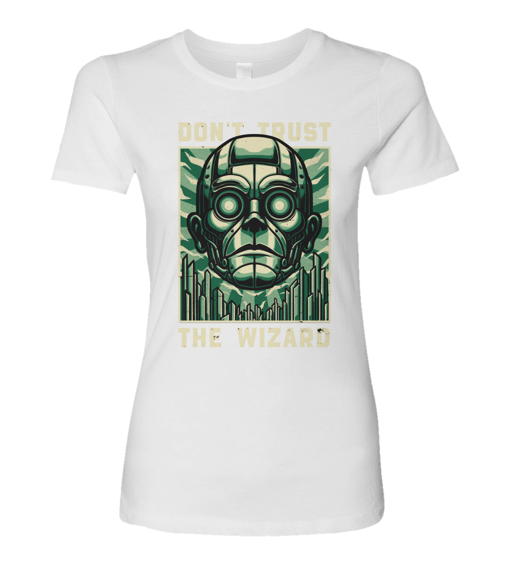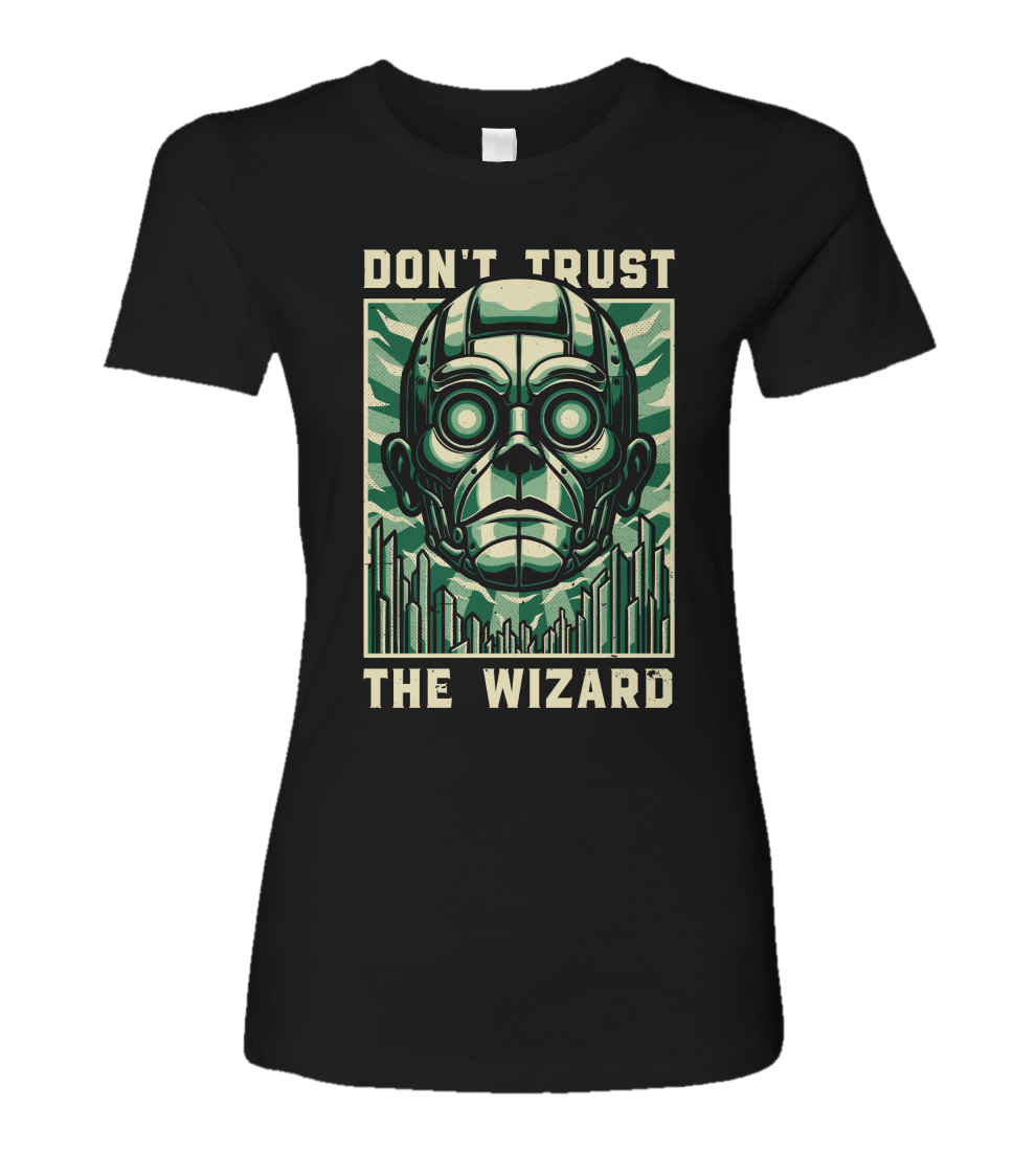 This cool and awesome t-shirt is perfect for those who love classic vintage retro movies, theater, witches, fantasy, and musicals. Featuring the magical head of the great wizard floating over a green city, with the quote "Don't trust the wizard".