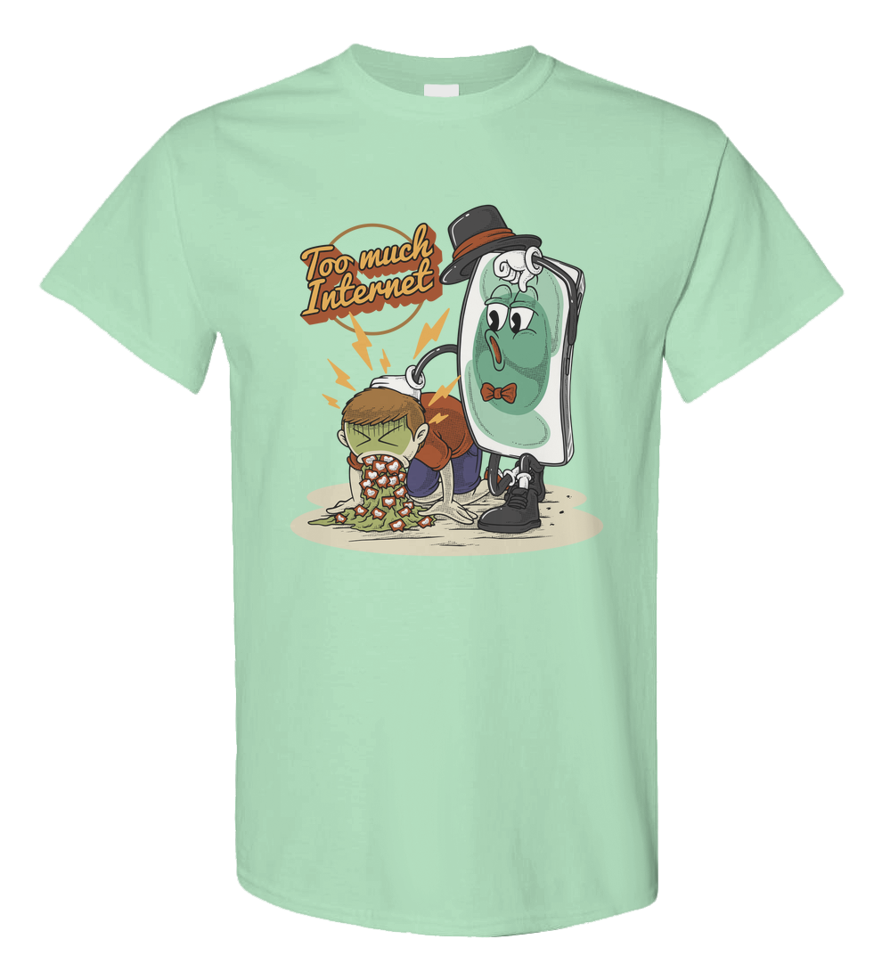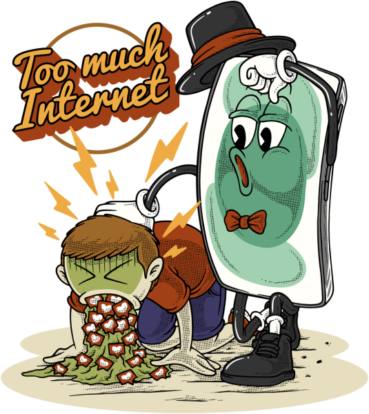 A dark humor illustration about internet overload. A retro cartoon scene showing how endless scrolling, notifications, and digital noise can literally make you sick. Perfect for internet addicts, doomscrollers, and fans of sarcastic, vintage-style art.