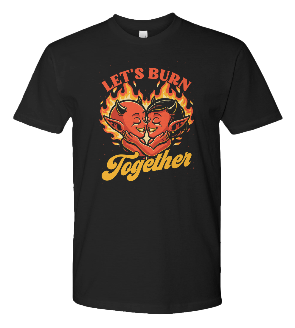 This awesome, cool, and funny t-shirt is perfect for those who love spooky devils, creepy creatures, Halloween, love, fire, Valentine's Day, hearts, and scary artwork. It features a cute demon couple holding each other inside a burning flame heart in an old school vintage tattoo style. With the quote "Let's burn together.".