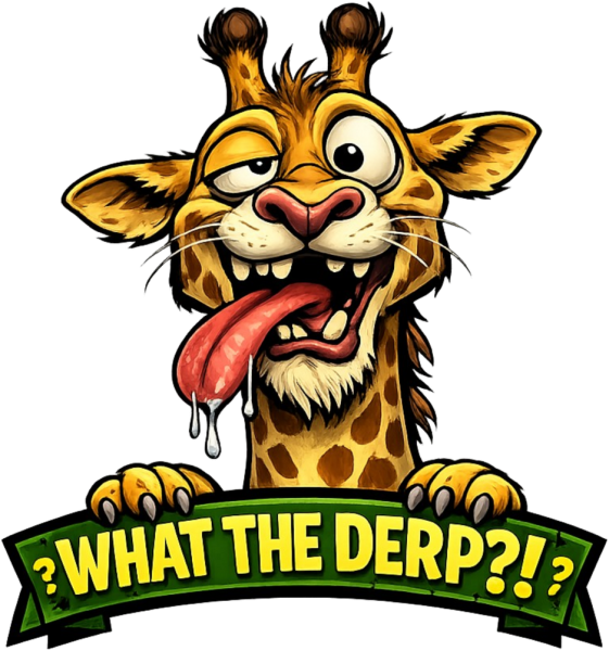 Beneath the head, a curved banner in yellow-green carries the phrase WHAT THE DERP?!? in chunky, playful lettering that matches the irreverent tone of the artwork. Thick black outlines and bright color contrasts make the print stand out crisply against the shirts green fabric. Overall the design reads loud and whimsicalthe sort of cheeky, attention-grabbing graphic meant for someone with a sense of humor.