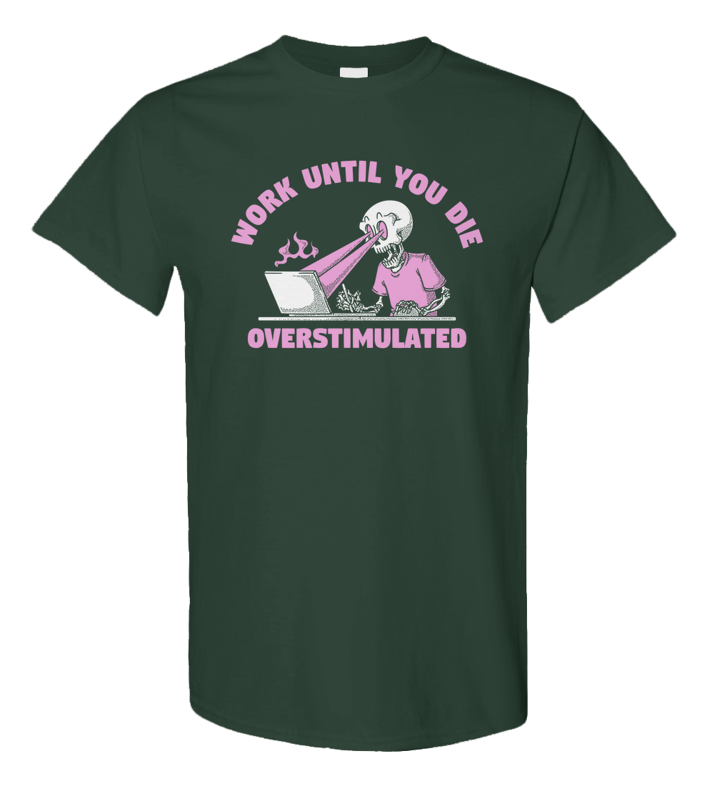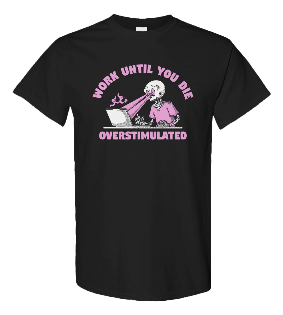 A dark humor retro cartoon featuring an overstimulated skeleton working nonstop in front of a laptop. Perfect for people who relate to burnout, work stress, toxic hustle culture, and sarcastic humor.