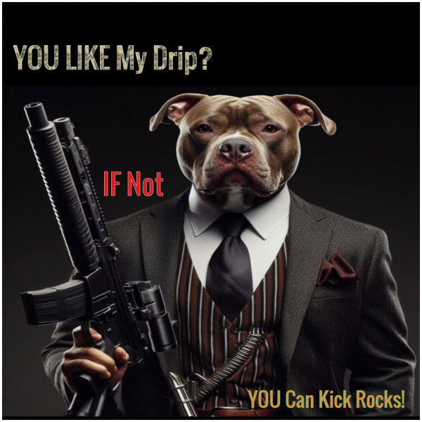 This captivating image showcases a pit bull dog donning a sleek suit and brandishing a gun, radiating confidence and attitude. The dog's bold and daring expression seems to challenge the viewer with the question, "Do you admire my style? If not, you can hit the road!" The contrast of a traditionally fierce breed like a pit bull in elegant attire creates a powerful visual statement that is bound to grab attention and ignite discussions.